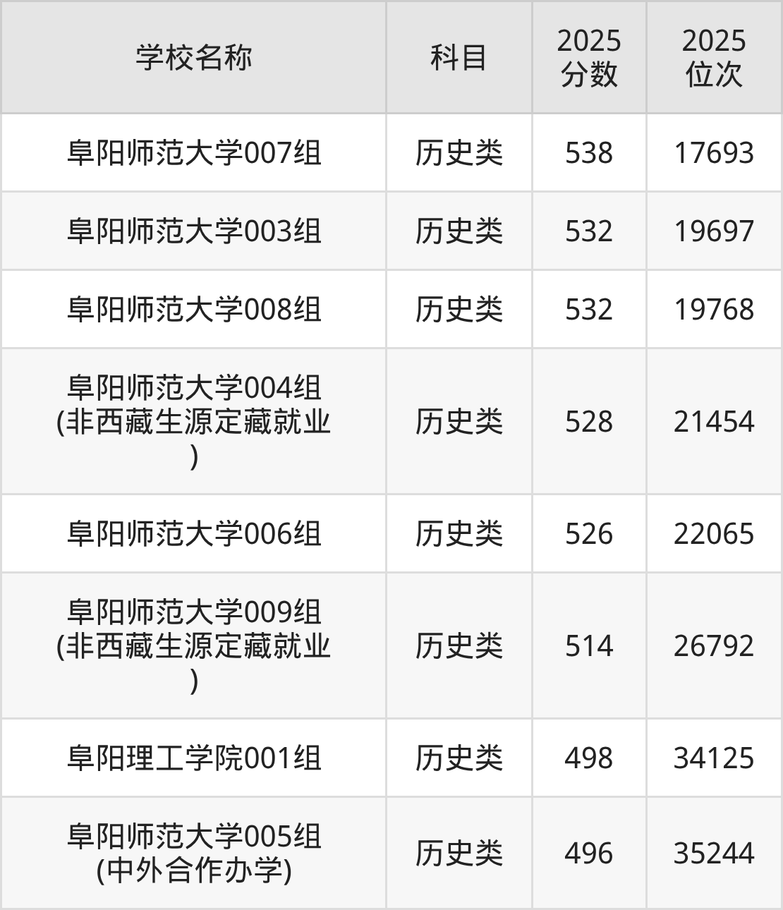 下文为2025年阜阳市本科大学在安徽历史类录取分数线和位次排名表,供大家参考: