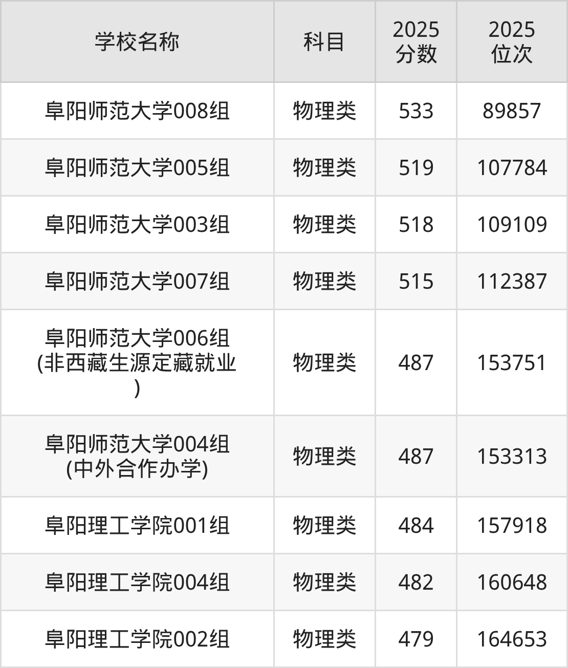 下文为2025年阜阳市本科大学在安徽物理类录取分数线和位次排名表,供大家参考: