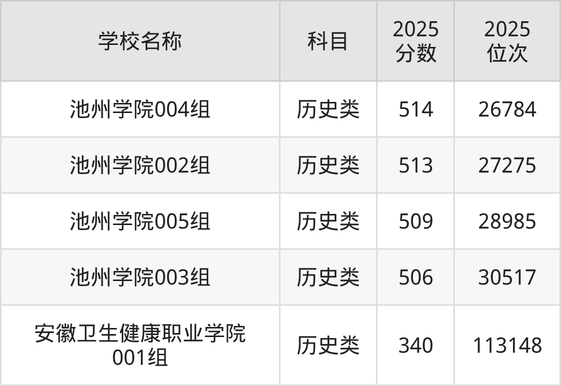 下文为2025年池州市综合类大学在安徽历史类录取分数线和位次排名表,供大家参考: