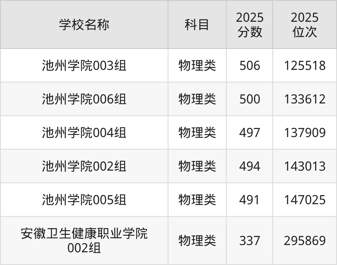 下文为2025年池州市综合类大学在安徽物理类录取分数线和位次排名表,供大家参考: