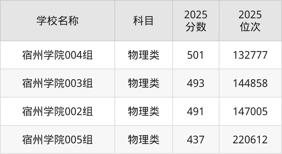 下文为2025年宿州市本科大学在安徽物理类录取分数线和位次排名表,供大家参考:
