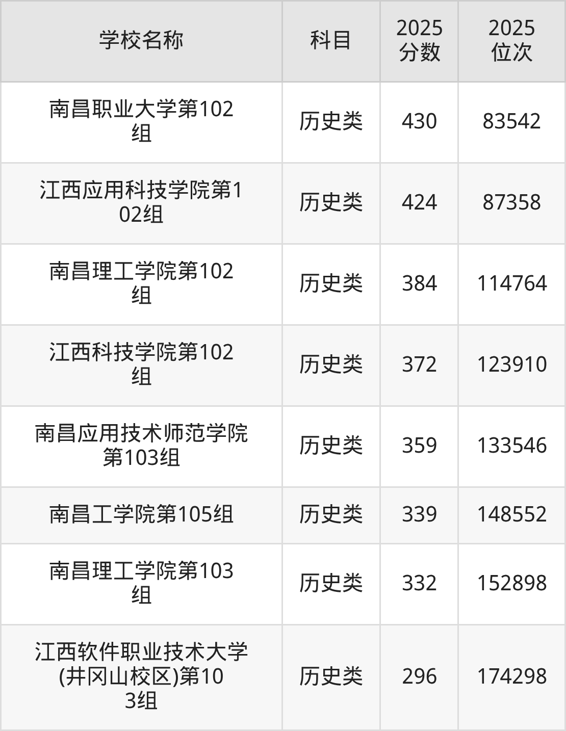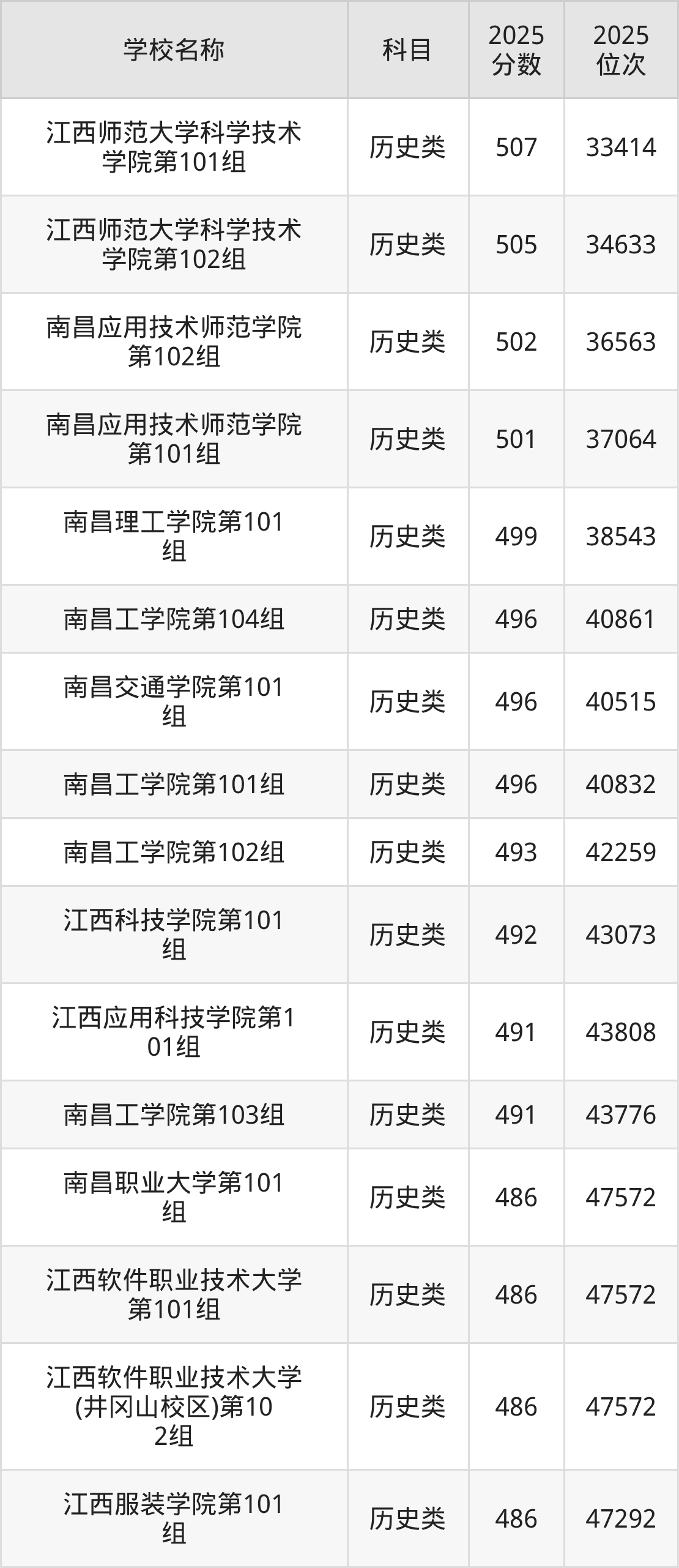 下文为2025年南昌市民办二本大学在江西历史类录取分数线和位次排名表,供大家参考:
