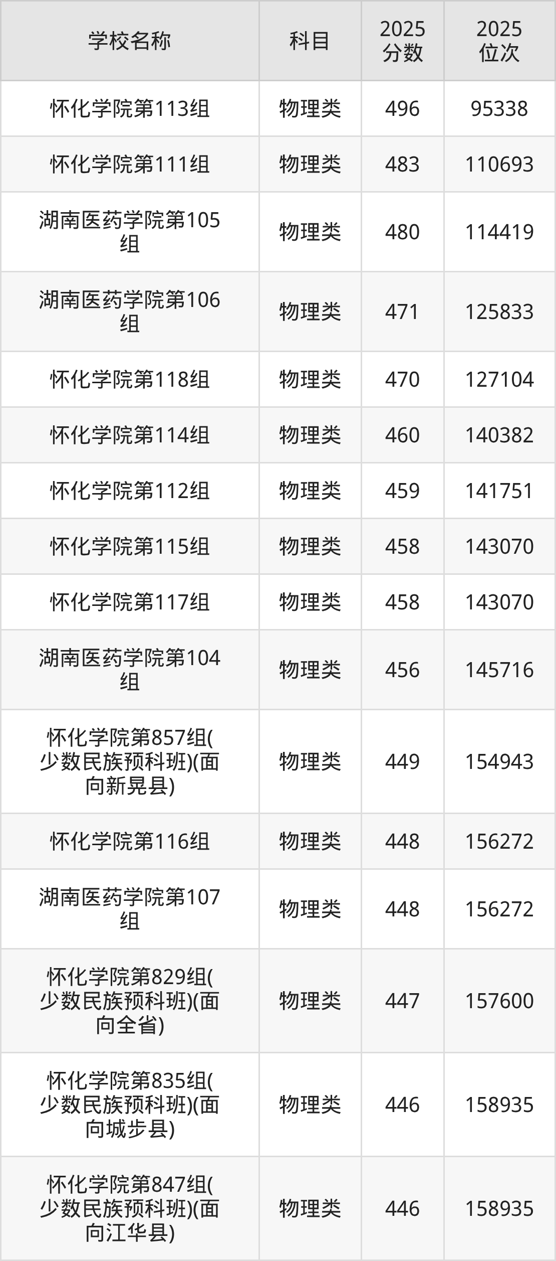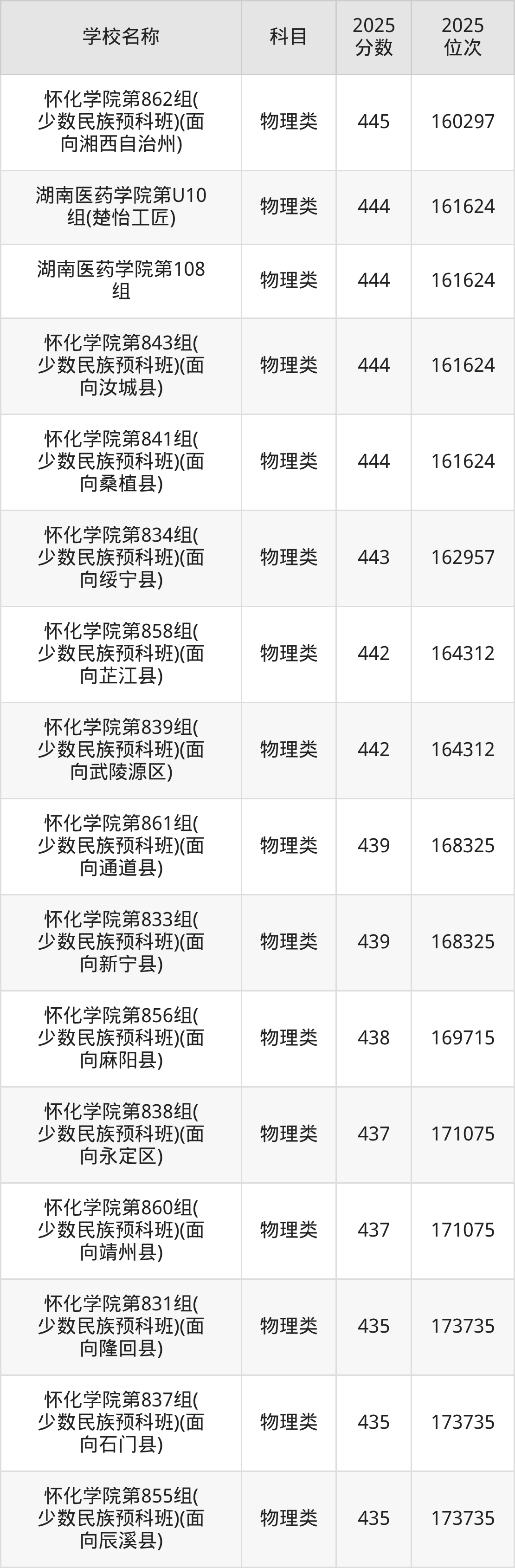下文为2025年怀化市本科大学在湖南物理类录取分数线和位次排名表,供大家参考: