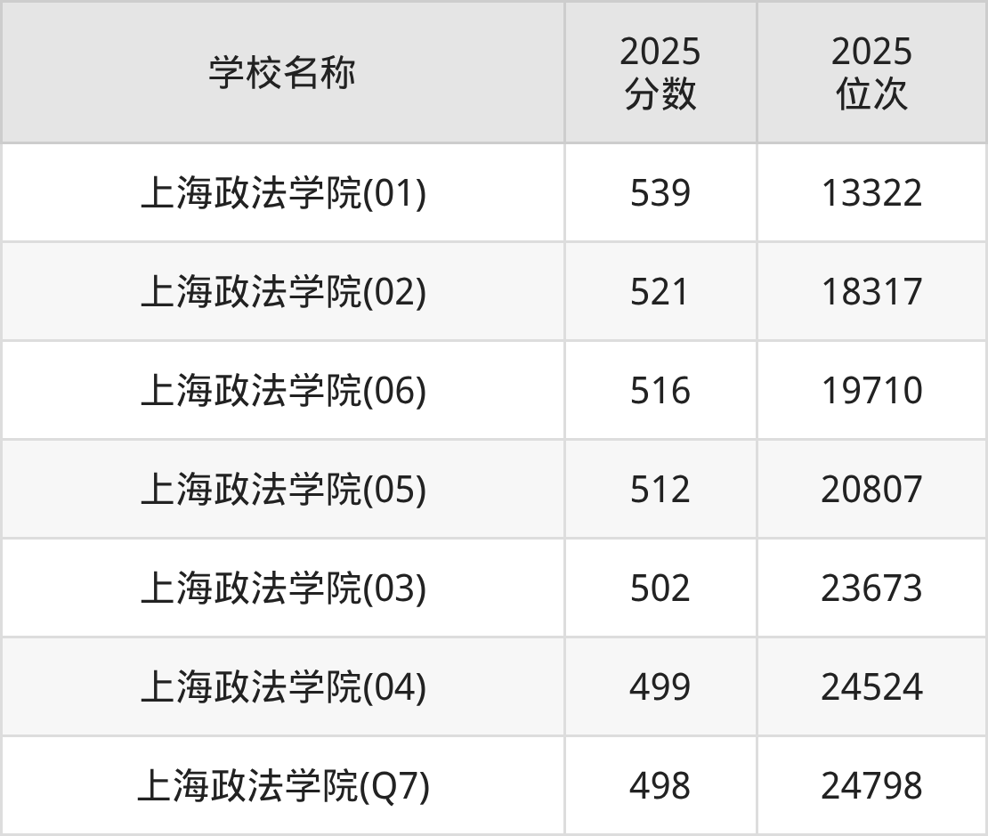 下文为2025年上海市二本政法大学在上海录取分数线和位次排名表,供大家参考: