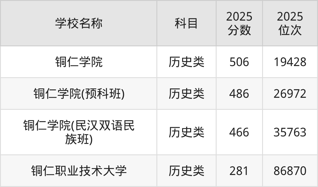 下文为2025年铜仁市本科大学在贵州历史类录取分数线和位次排名表,供大家参考: