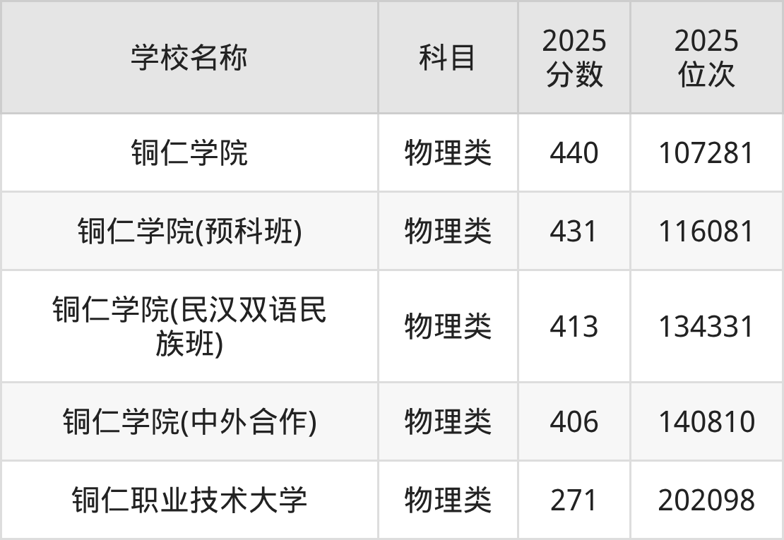 下文为2025年铜仁市本科大学在贵州物理类录取分数线和位次排名表,供大家参考: