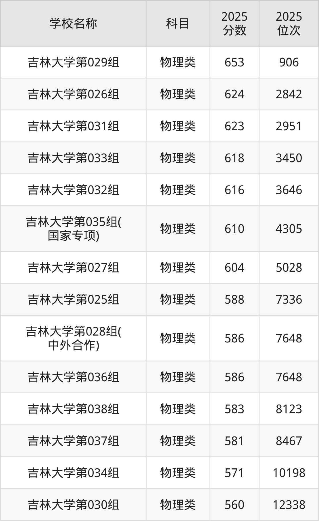 下文为2025年吉林省985大学在吉林物理类录取分数线和位次排名表,供大家参考: