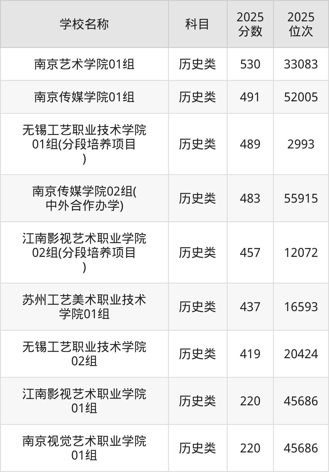 下文为2025年江苏省艺术类大学在江苏历史类录取分数线和位次排名表,供大家参考: