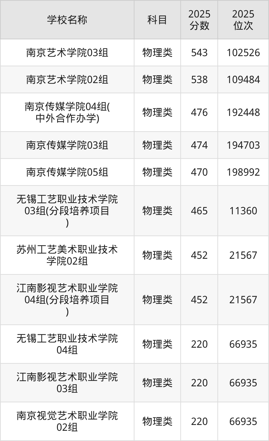 下文为2025年江苏省艺术类大学在江苏物理类录取分数线和位次排名表,供大家参考: