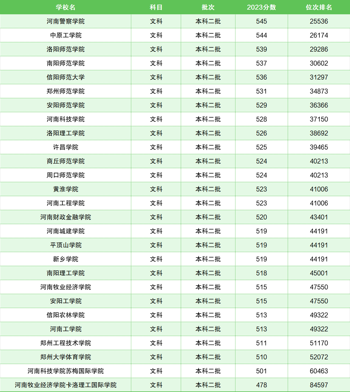 2023年河南省文科公办二本大学共计27所,其中录取最低位次排名排在倒数5名的院校有: