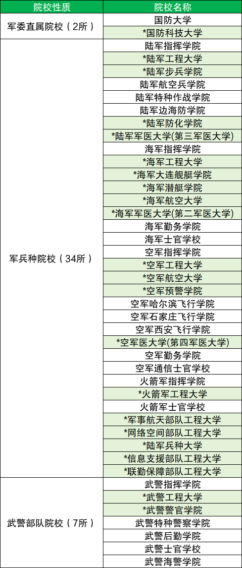 全国军校共有43所,其中2025年在高考招生的22所院校名单,具体如下:
