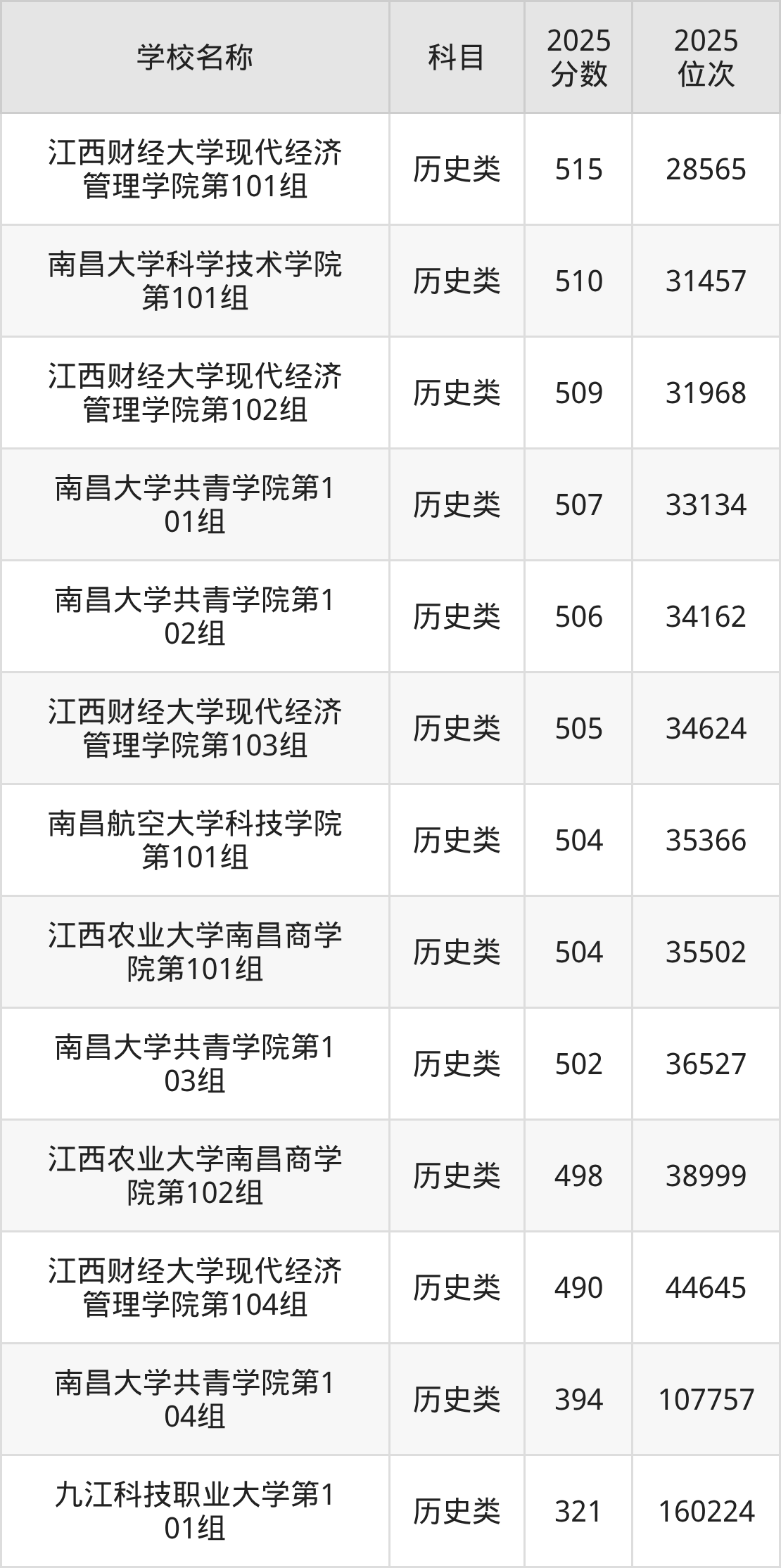 下文为2025年九江市民办二本大学在江西历史类录取分数线和位次排名表,供大家参考: