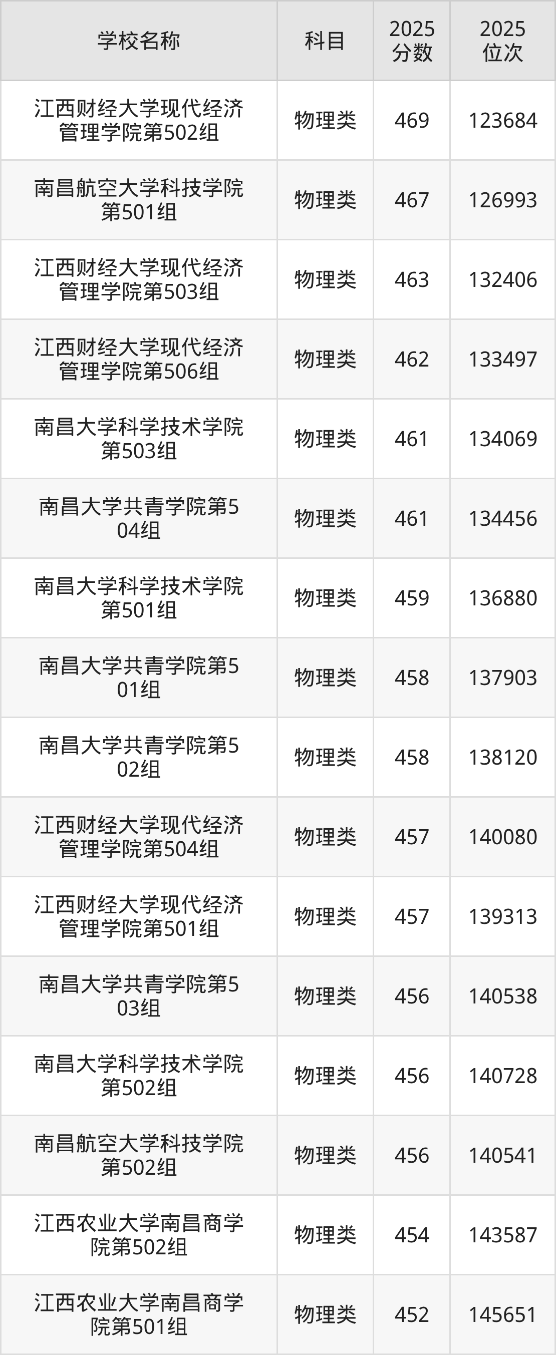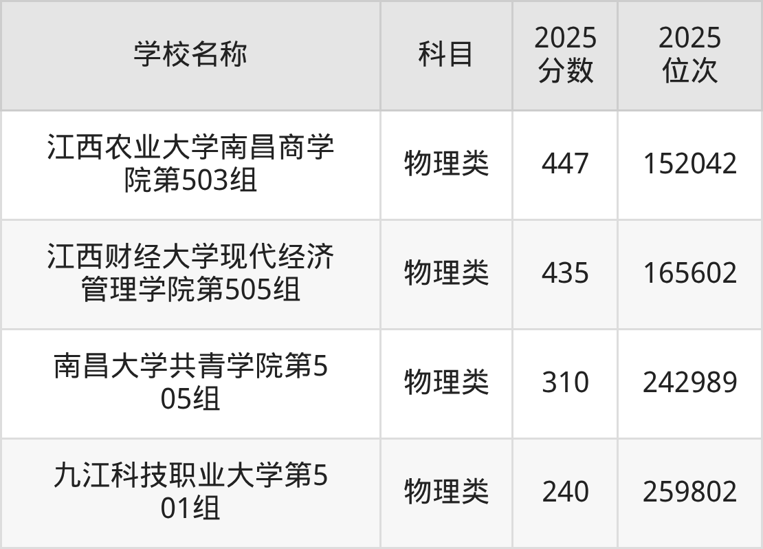 下文为2025年九江市民办二本大学在江西物理类录取分数线和位次排名表,供大家参考: