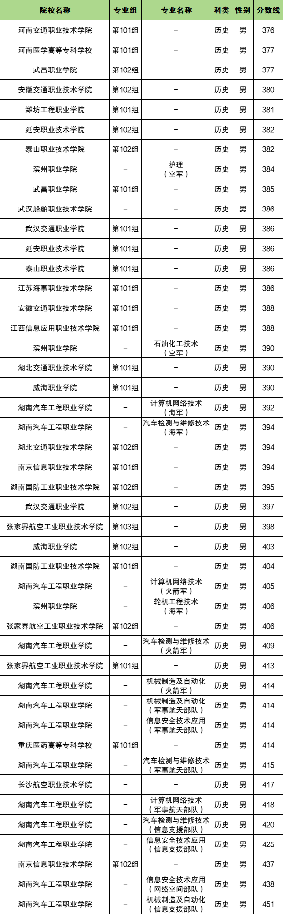 2024年在湖南历史类招男生的定向士官学校有20所,其中分数线最高的是湖南汽车工程职业学院,2024最低分451分;分数线最低的是河南交通职业技术学院(第101组),2024最低分376分。