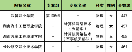 2024年在湖南物理类招女生士官的学校只有3所,其中分数线较高的是长沙航空职业技术学院,2024最低分461分;分数线较低的是武昌职业学院(第106组),2024最低分447分。