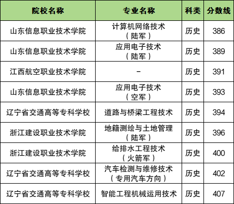 分数线最低的是山东信息职业技术学院,2024最低分386分。录取分最高的是辽宁省交通高等专科学校,2024最低分407分。