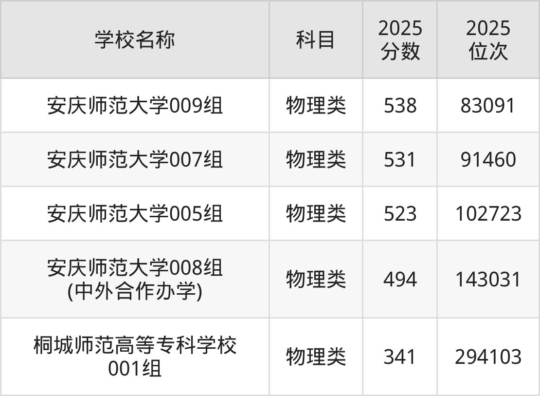 下文为2025年安庆市师范类大学在安徽物理类录取分数线和位次排名表,供大家参考: