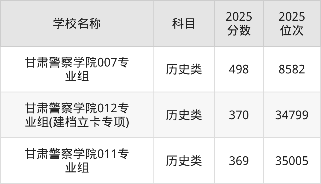 下文为2025年甘肃省公安警察大学在甘肃历史类录取分数线和位次排名表,供大家参考: