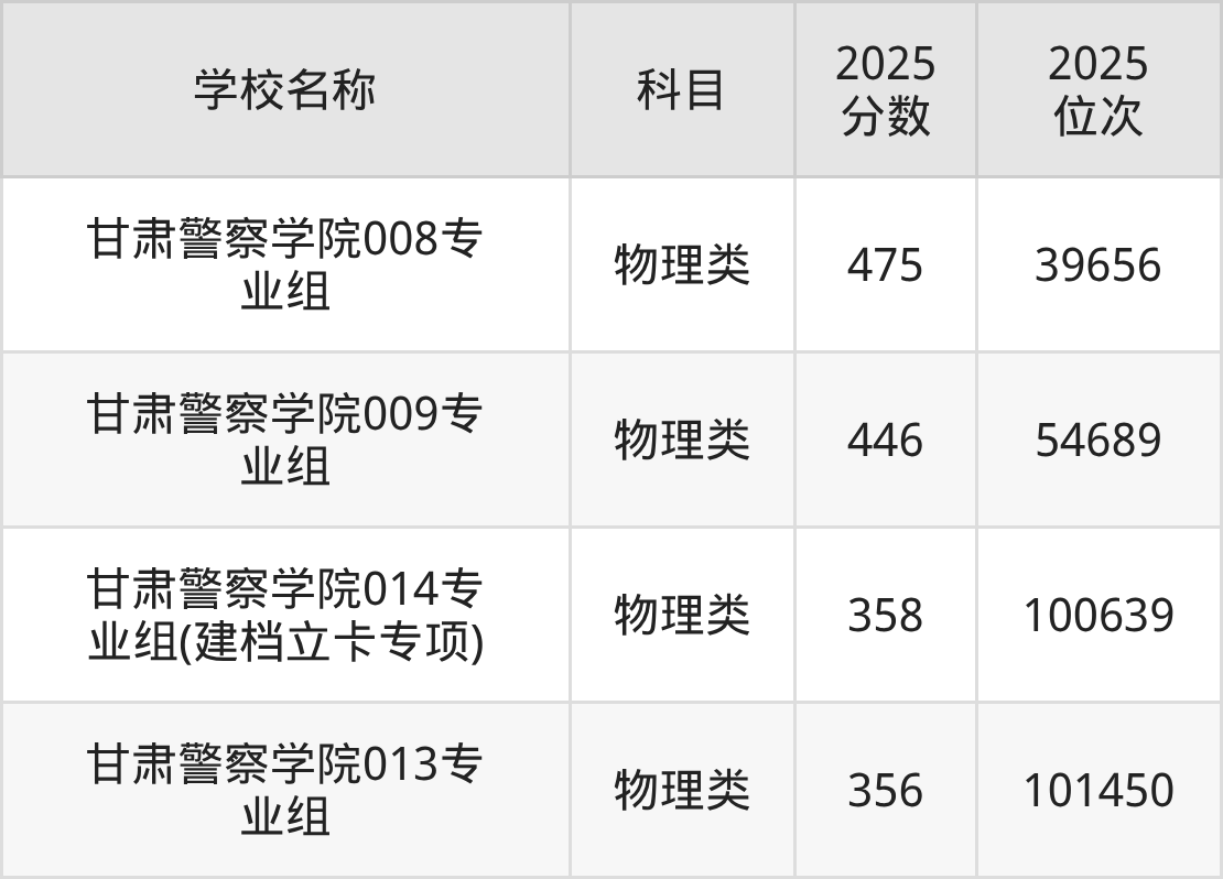 下文为2025年甘肃省公安警察大学在甘肃物理类录取分数线和位次排名表,供大家参考: