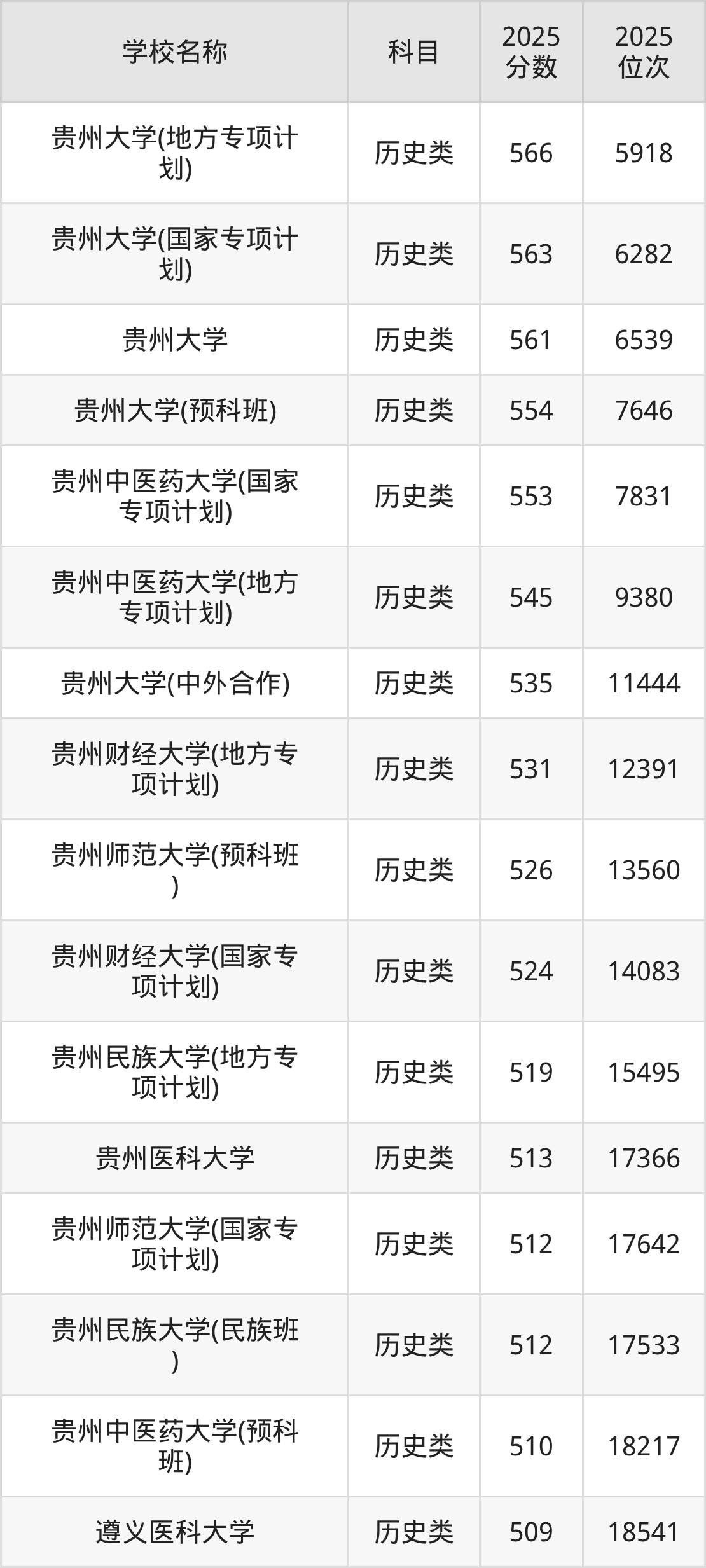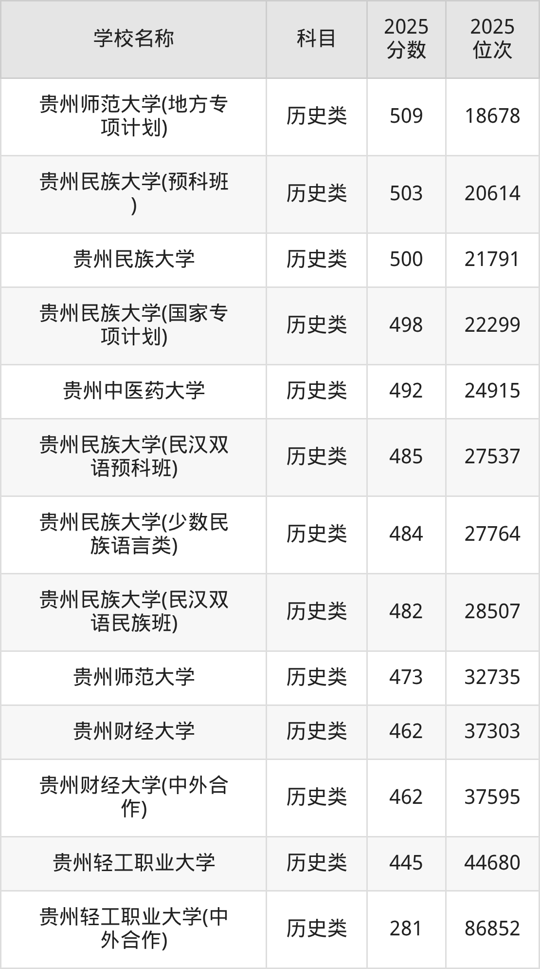 下文为2025年贵州省一本大学在贵州历史类录取分数线和位次排名表,供大家参考:
