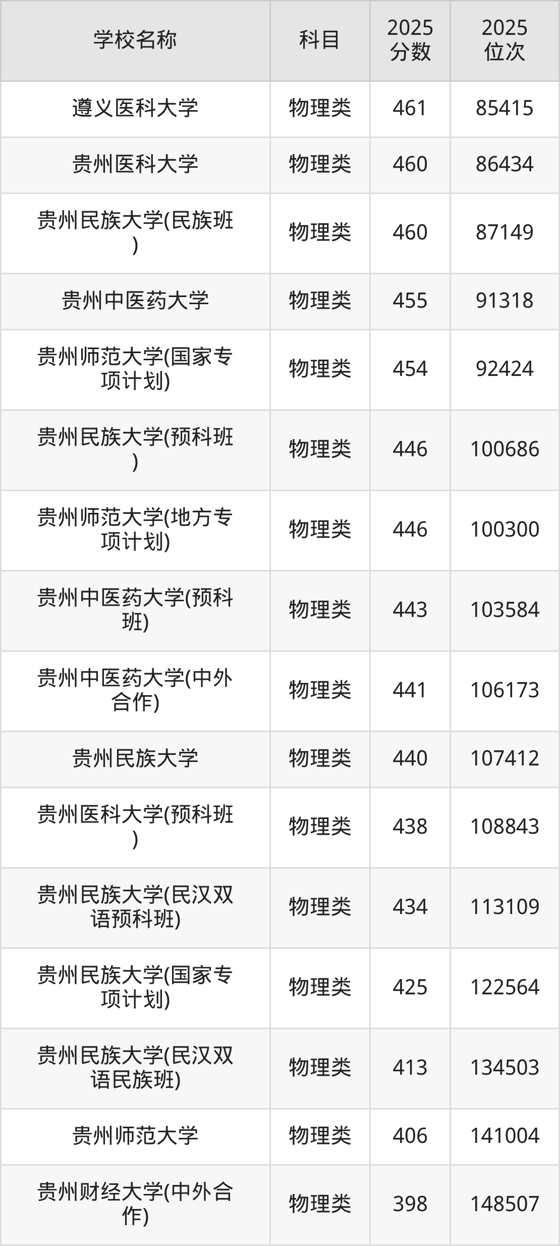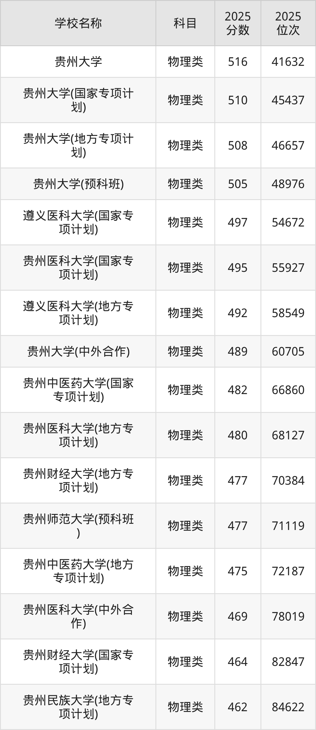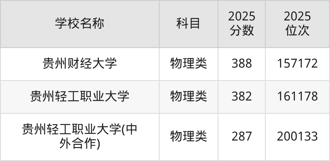 下文为2025年贵州省一本大学在贵州物理类录取分数线和位次排名表,供大家参考: