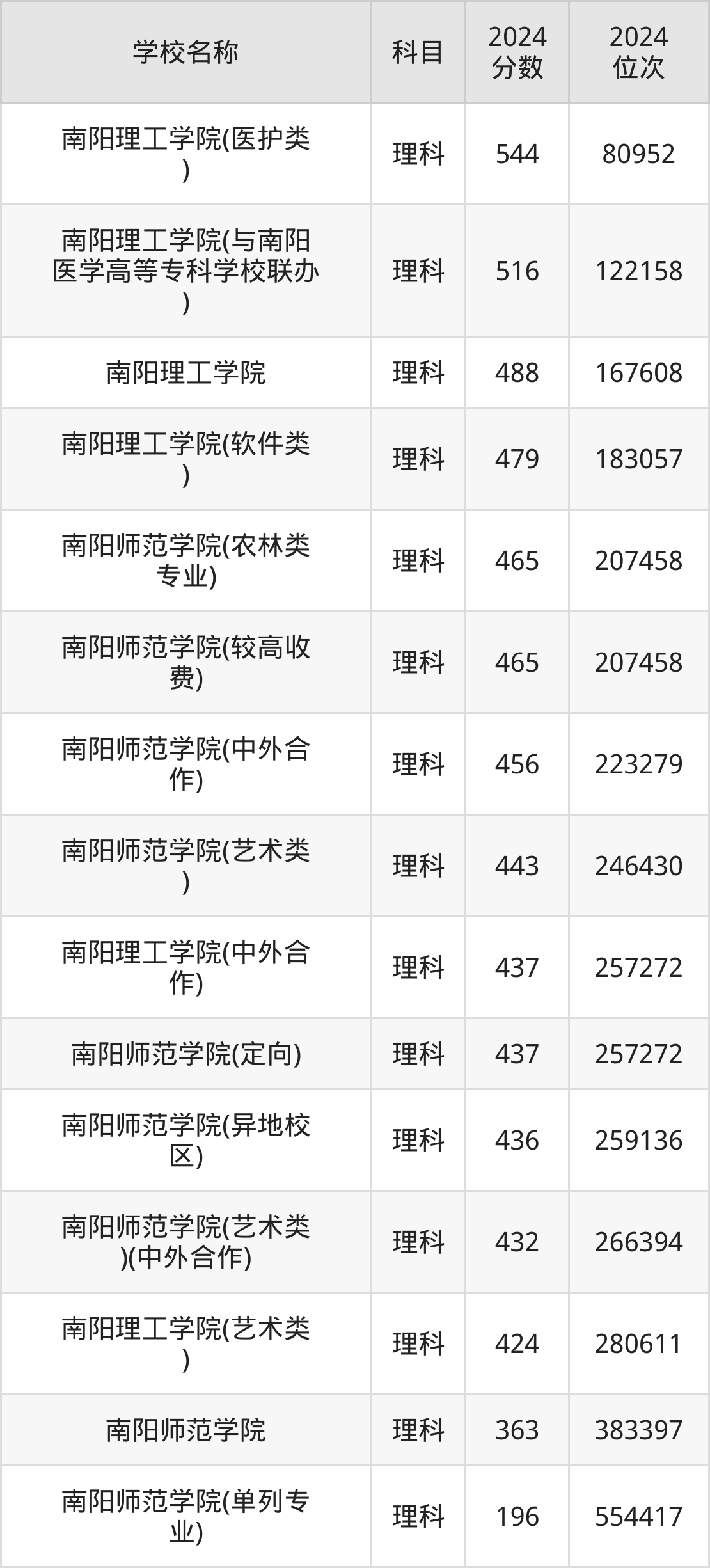 下文为2024年南阳市本科大学在河南理科录取分数线和位次排名表,供大家参考: