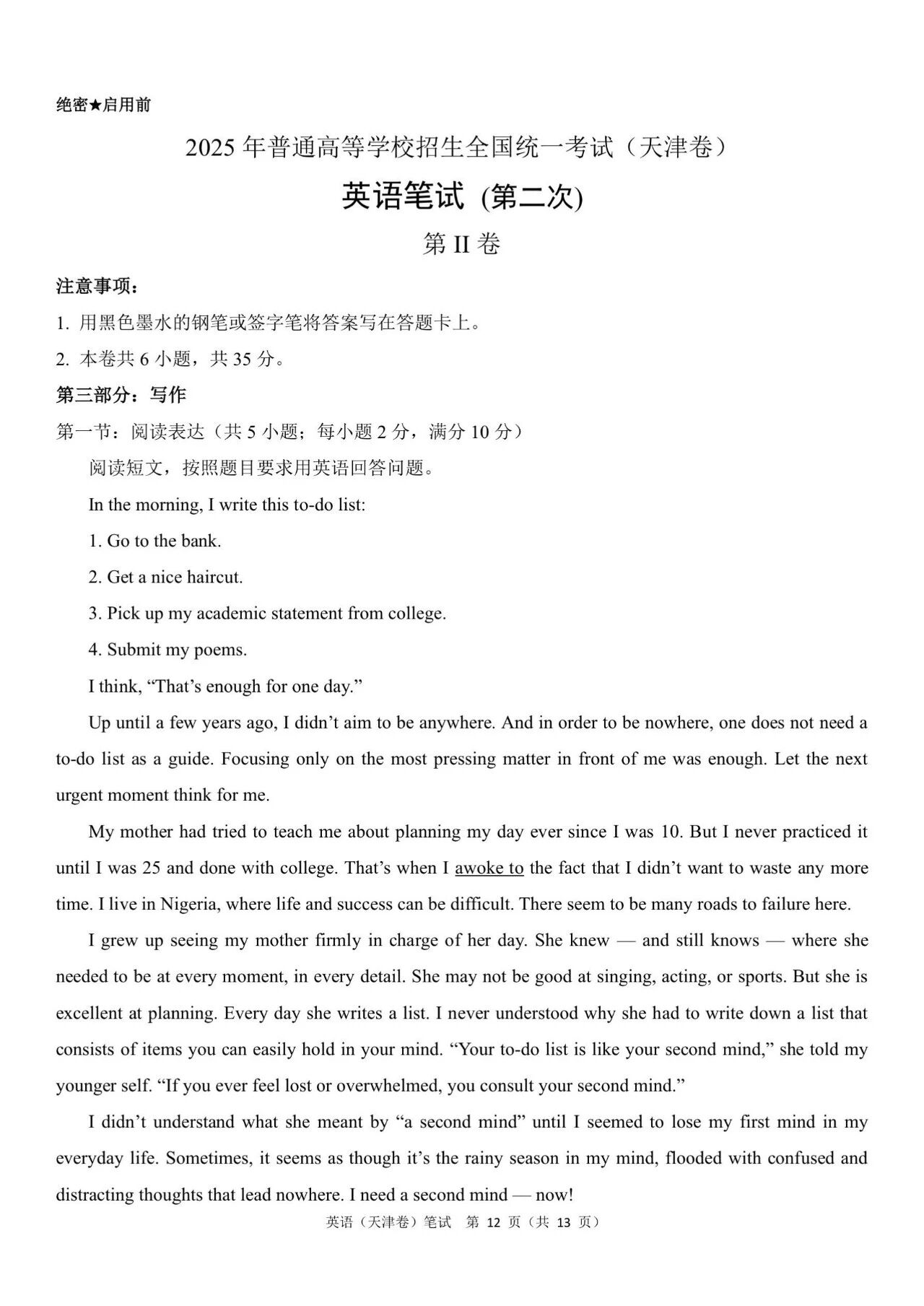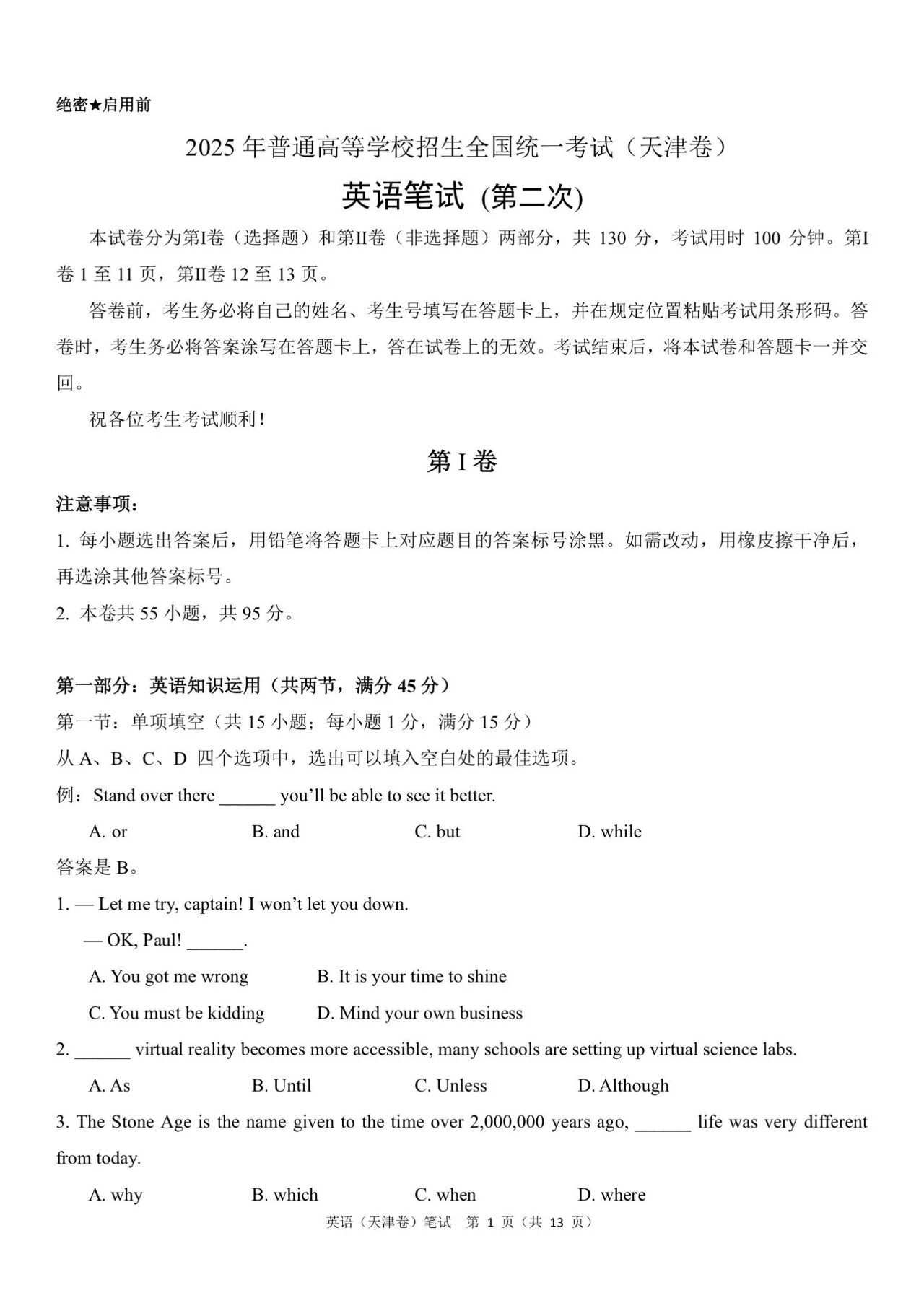 一、2025年高考天津卷英语真题及答案