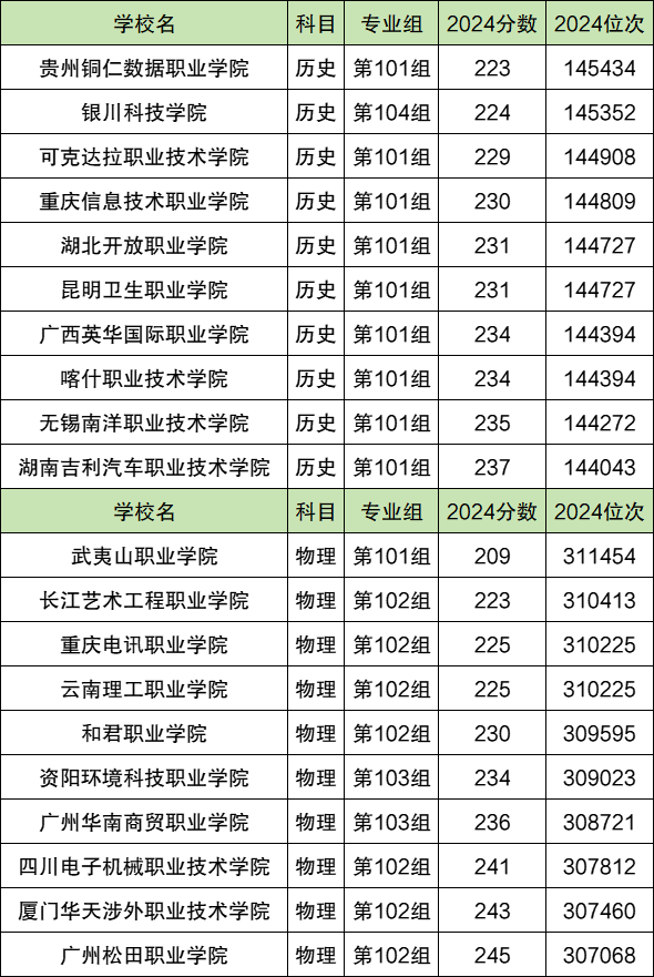 2024年湖南专科大学最低分数线历史组是223分,物理组是209分,对比湖南当年专科线可发现:首选历史科目的考生最低超过专科线23分、首选物理科目的考生最低超过专科线9分即可有机会上专科大学。