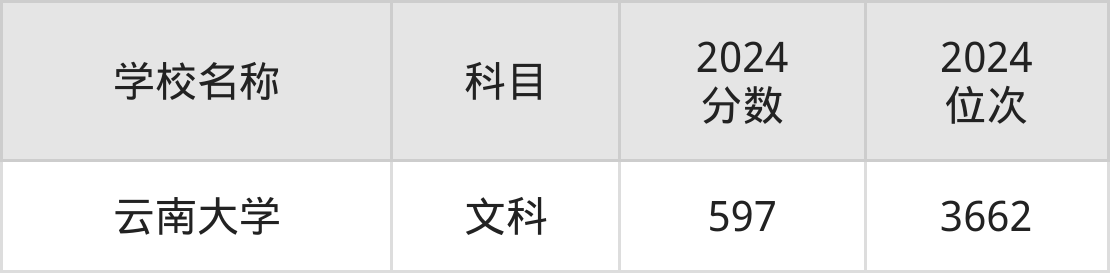 下文为2024年云南省211大学在云南文科录取分数线和位次排名表,供大家参考: