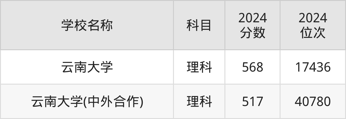 下文为2024年云南省211大学在云南理科录取分数线和位次排名表,供大家参考: