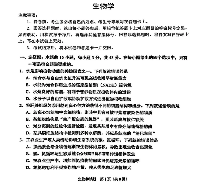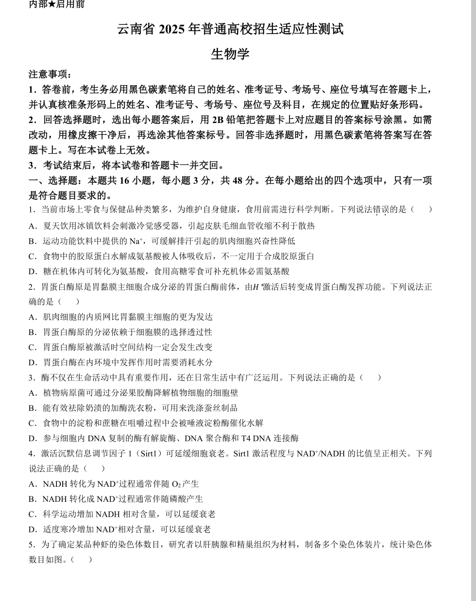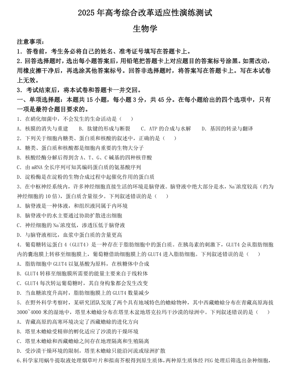 2025年新高考八省联考生物试卷并非教育部统一命题,而是由各省自主命题,因此本次考试存在8套试卷。为确保第五批新高考改革省份考生均能够核对到本省试卷答案,本文收集汇总了此次新高考适应性考试各省的生物试卷及答案。