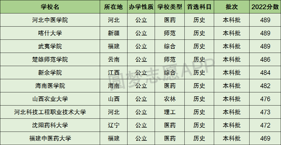 从上面的图中可以看出,福建历史类二本线10分以内的公办大学有山西农业大学、河北科技工程职业技术大学、沈阳药科大学、福建中医药大学。其中,福建历史类分数线最低的公办二本大学为福建中医药大学 ,该学校的录取分数为469分,高出二本线1分。