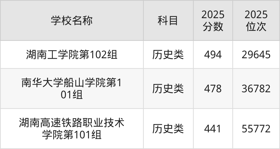 下文为2025年衡阳市理工类大学在湖南历史类录取分数线和位次排名表,供大家参考: