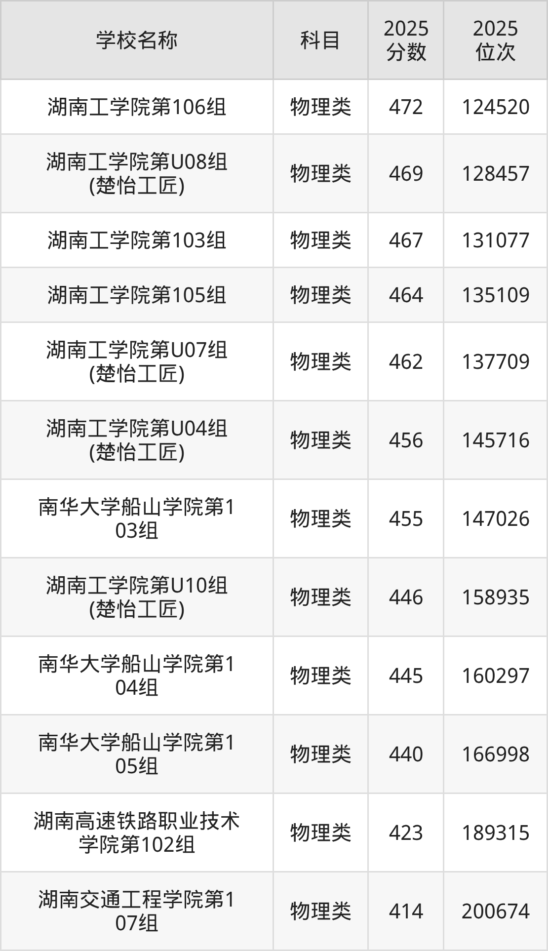 下文为2025年衡阳市理工类大学在湖南物理类录取分数线和位次排名表,供大家参考: