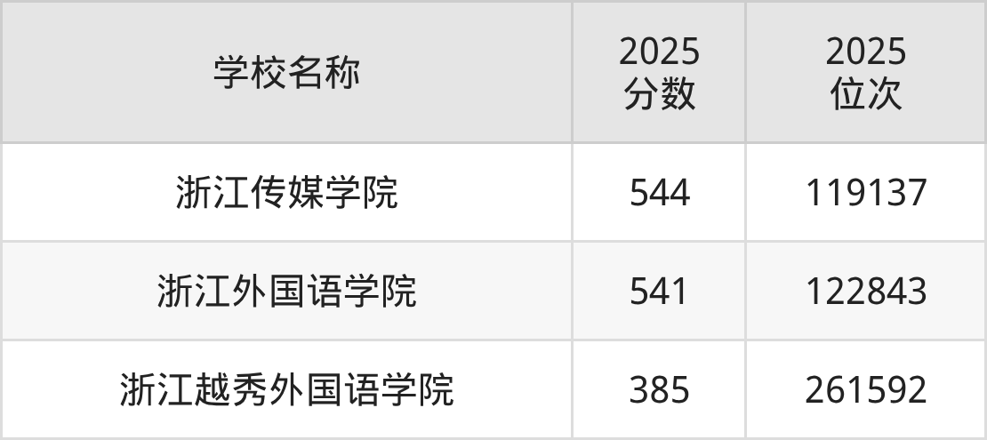 下文为2025年浙江省语言类大学在浙江录取分数线和位次排名表,供大家参考: