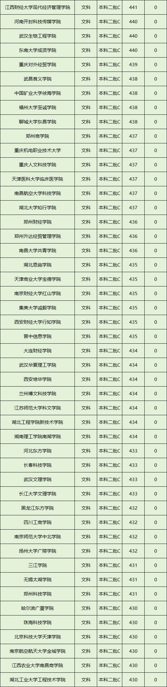 如430分可以报考的民办二本就有哈尔滨广厦学院、珠海科技学院、北京科技大学天津学院、南京航空航天大学金城学院、江西农业大学南昌商学院、湖北工业大学工程技术学院;431分可以报考的民办二本有三江学院、无锡太湖学院、郑州科技学院。