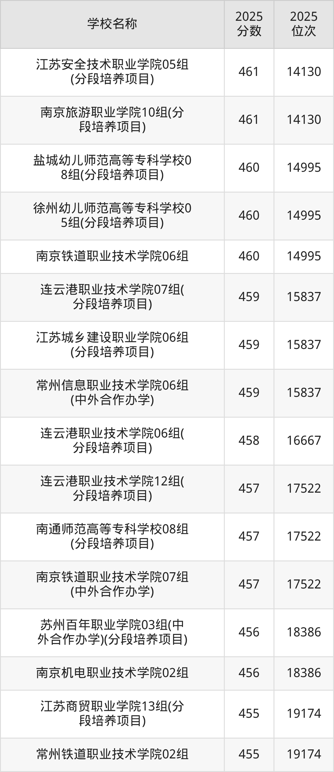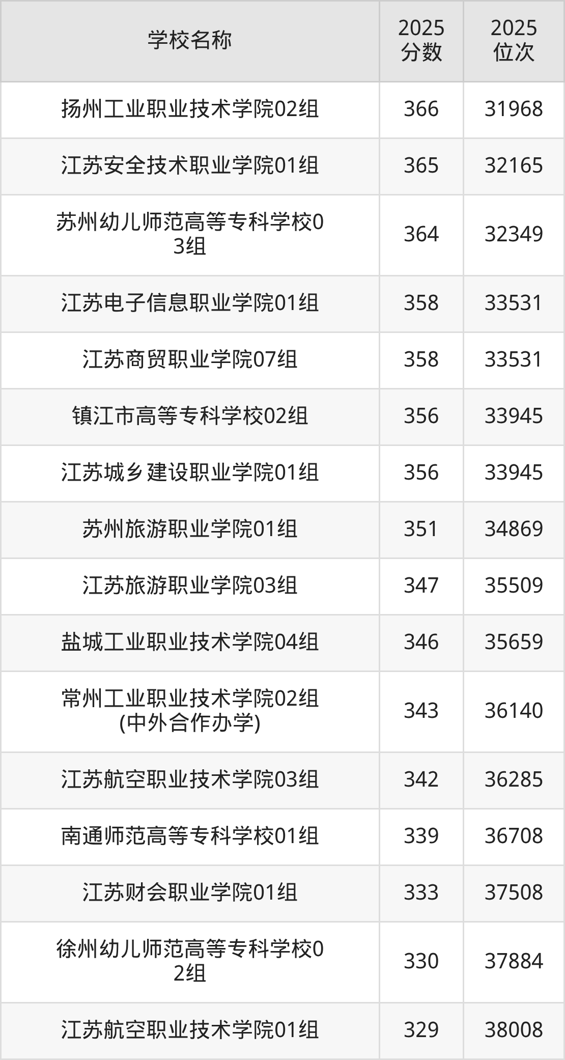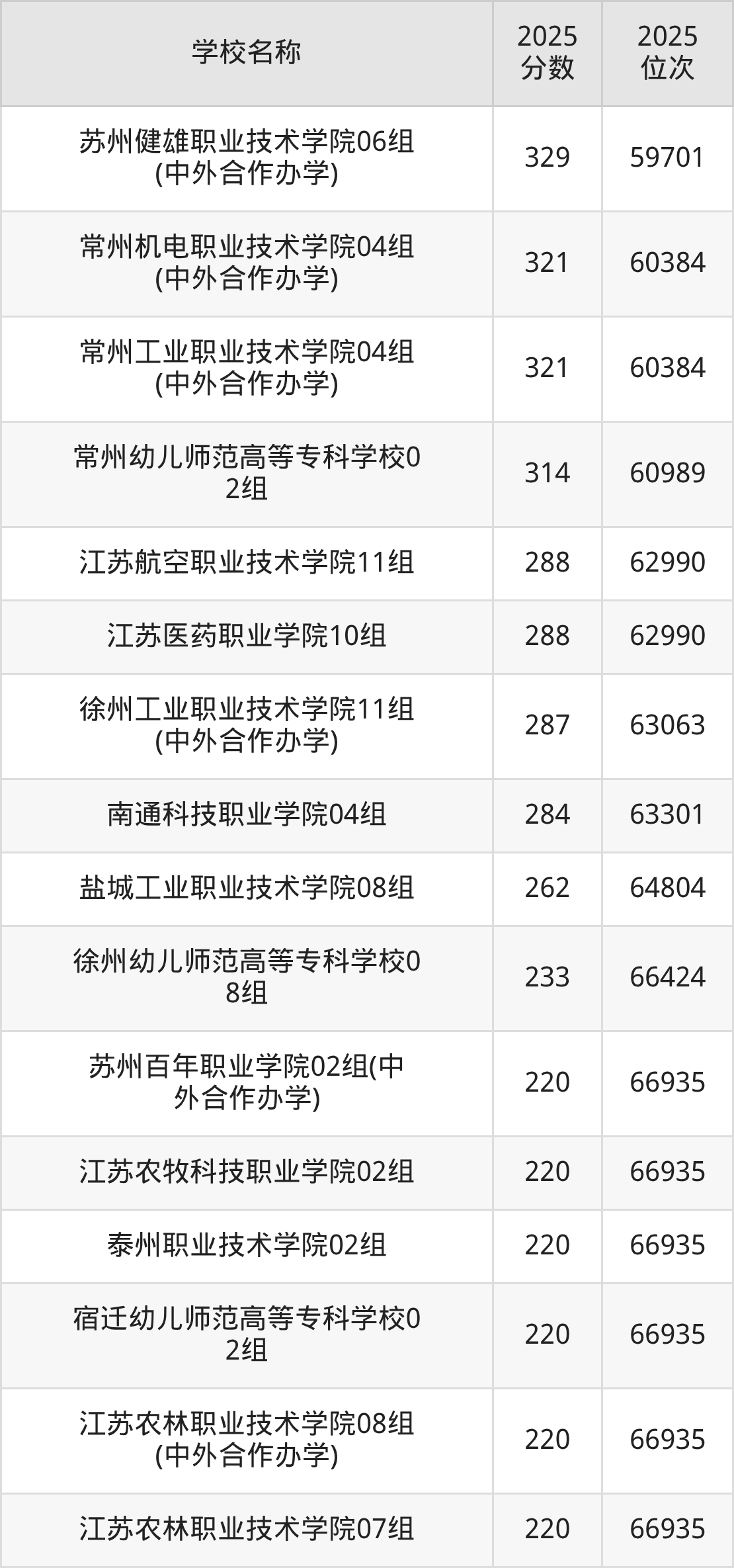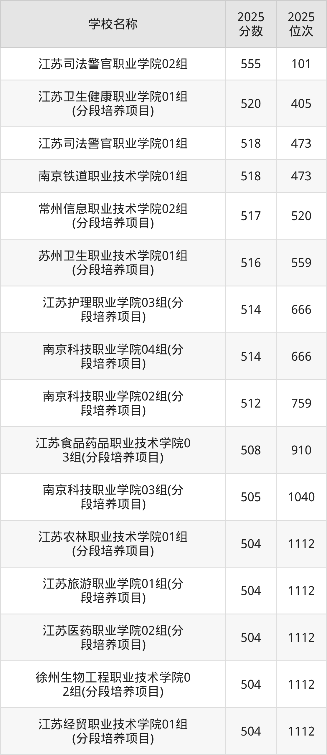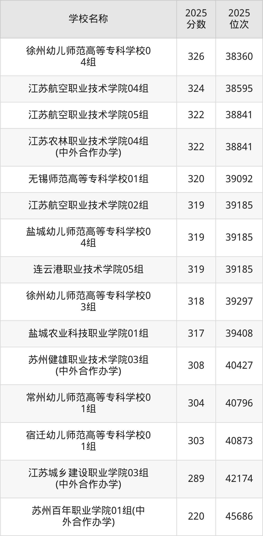 下文为2025年江苏省公办专科大学在江苏物理类录取分数线和位次排名表,供大家参考: