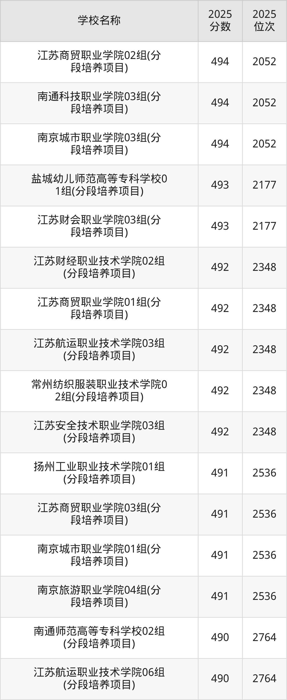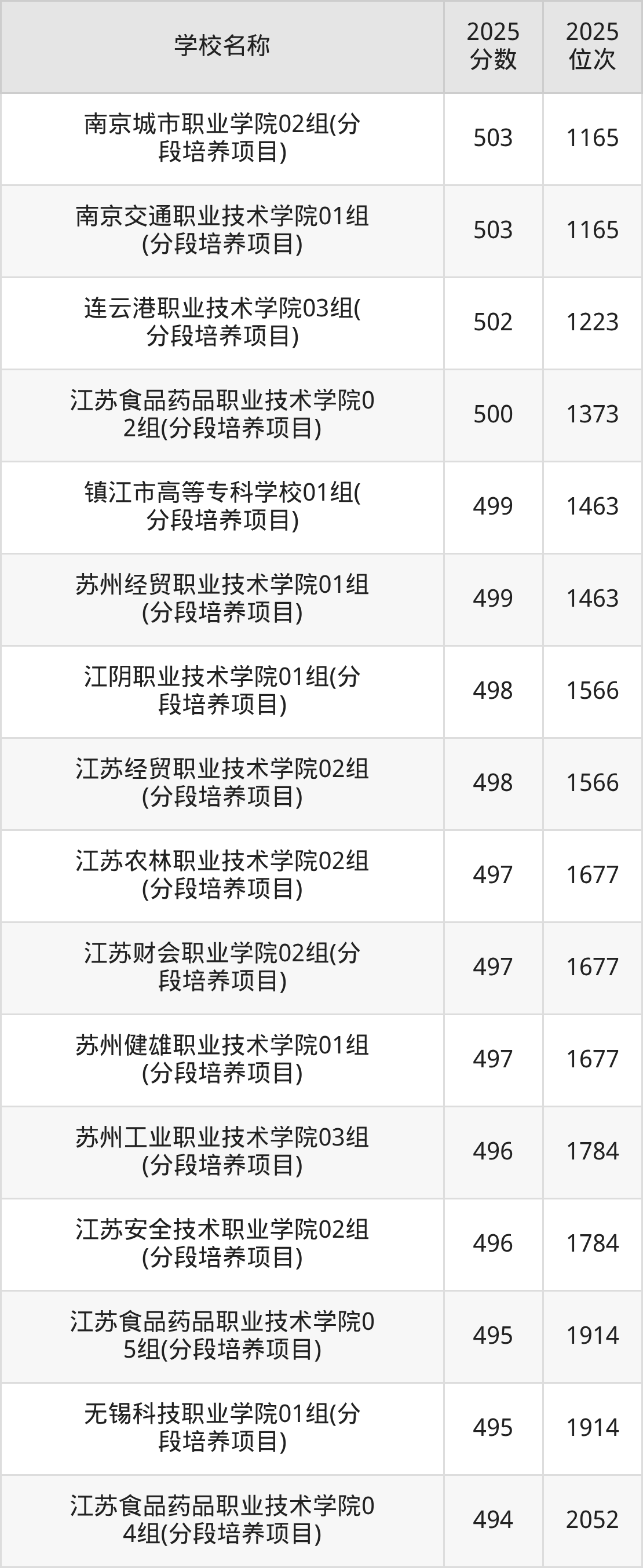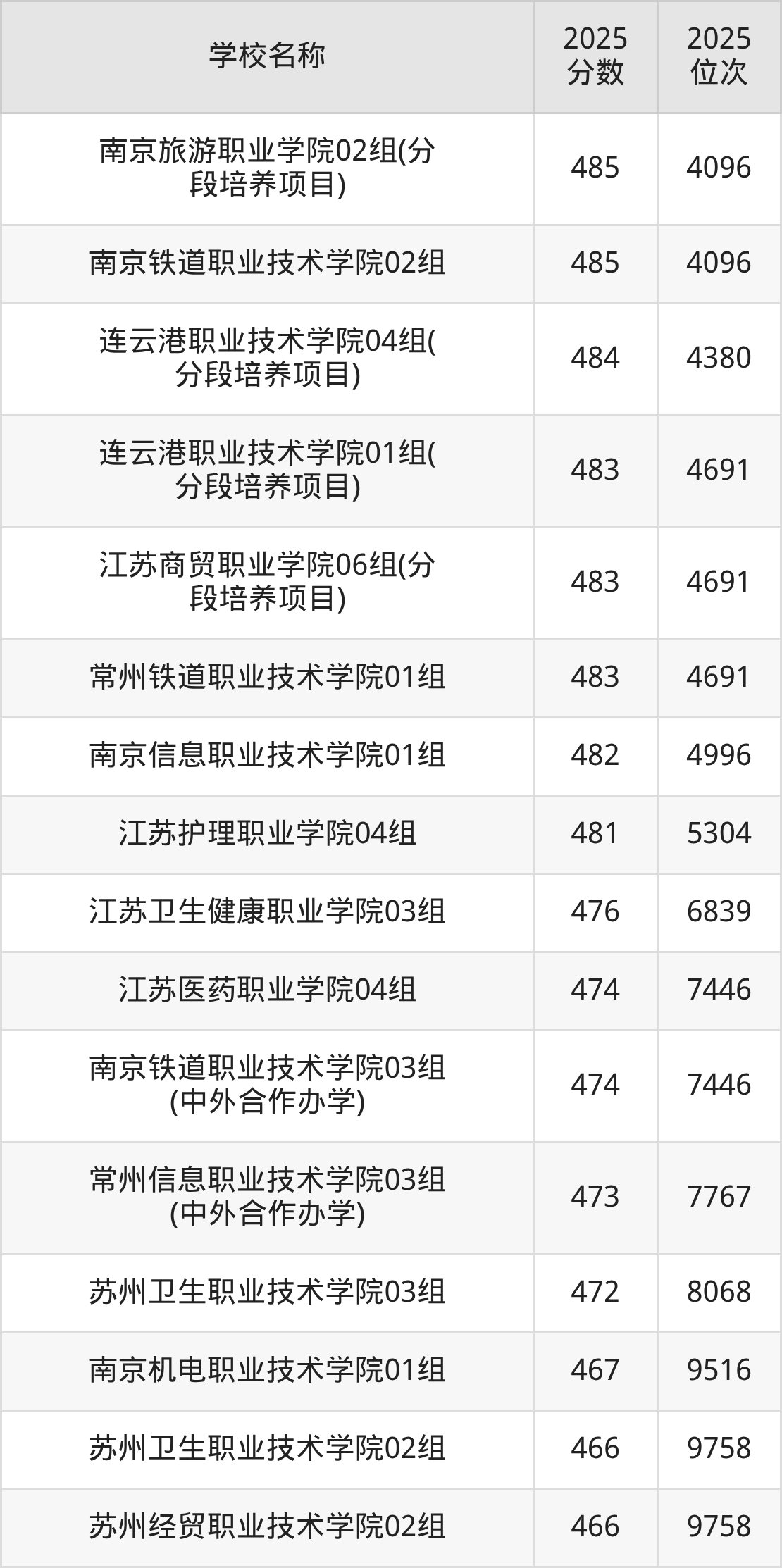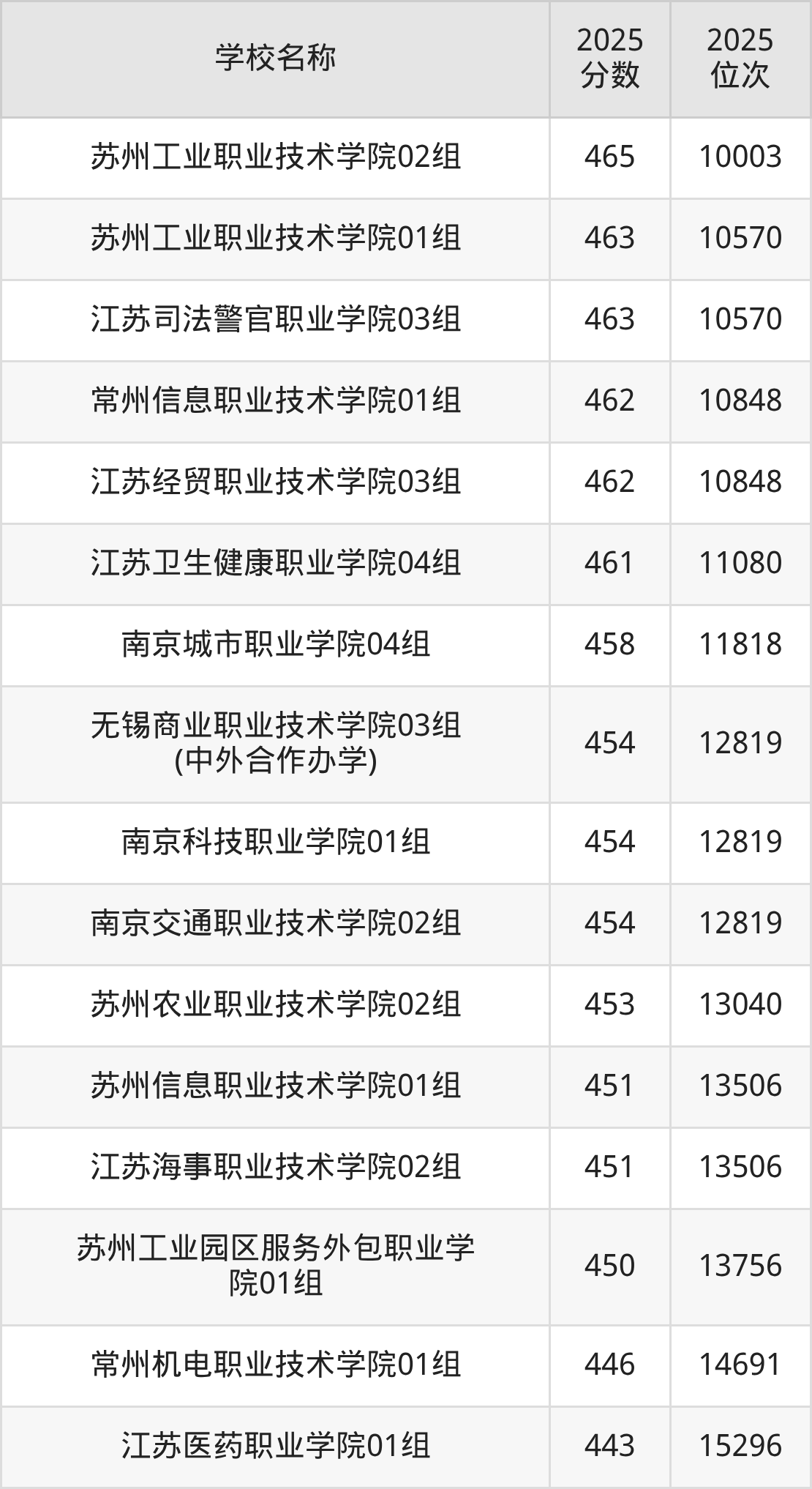 下文为2025年江苏省公办专科大学在江苏物理类录取分数线和位次排名表,供大家参考: