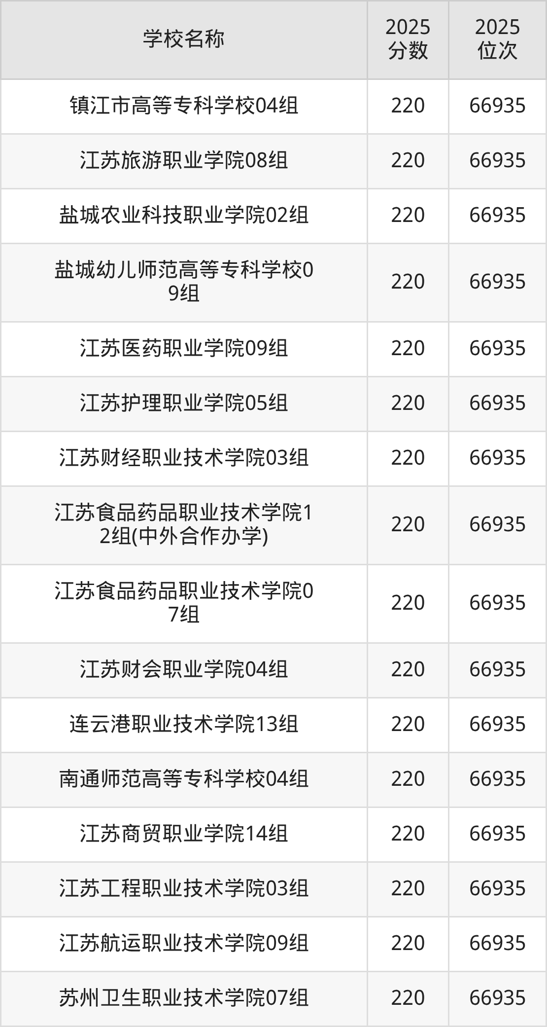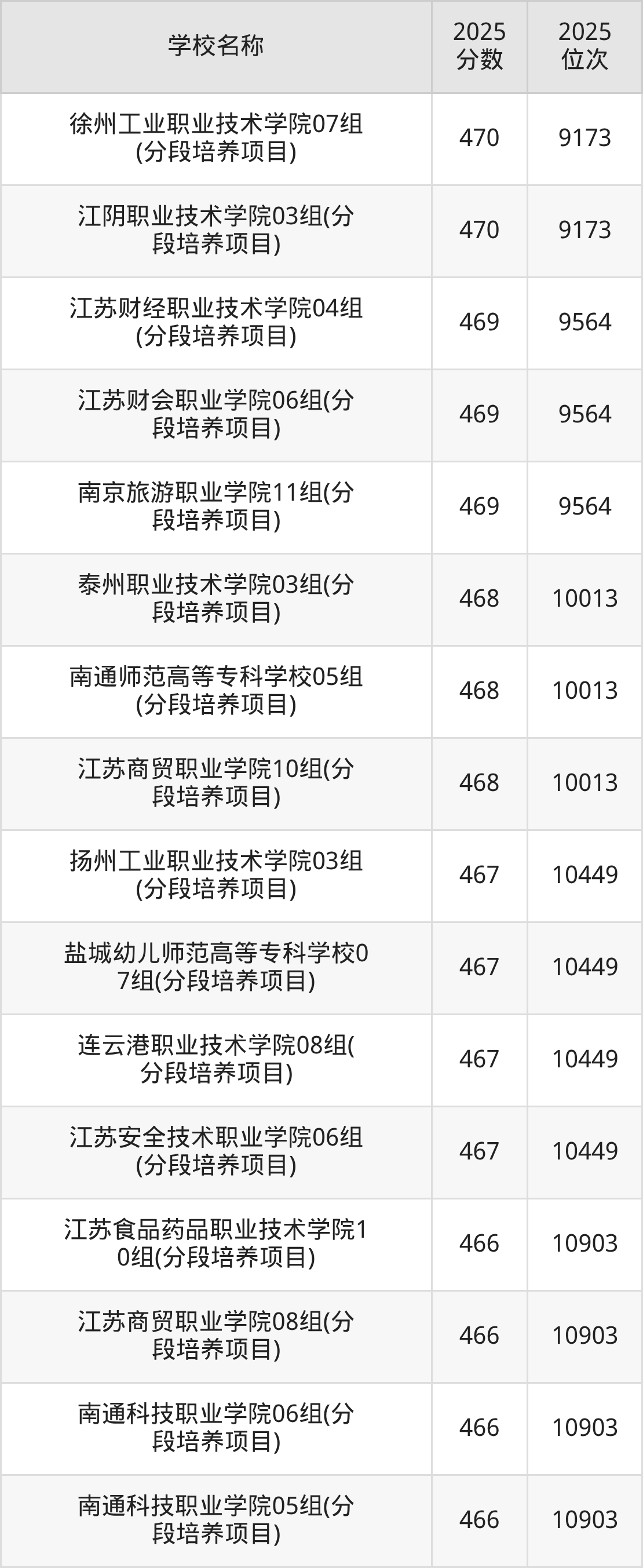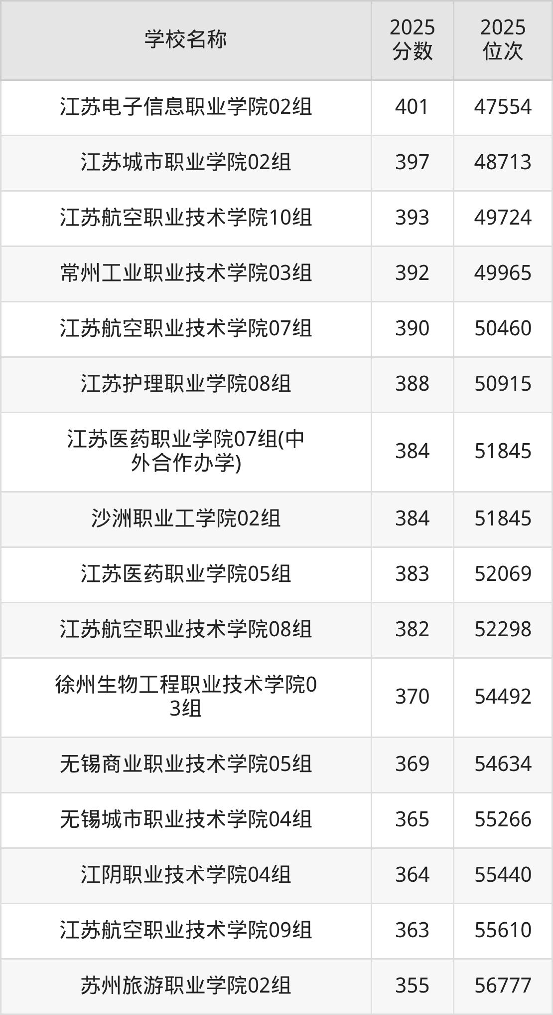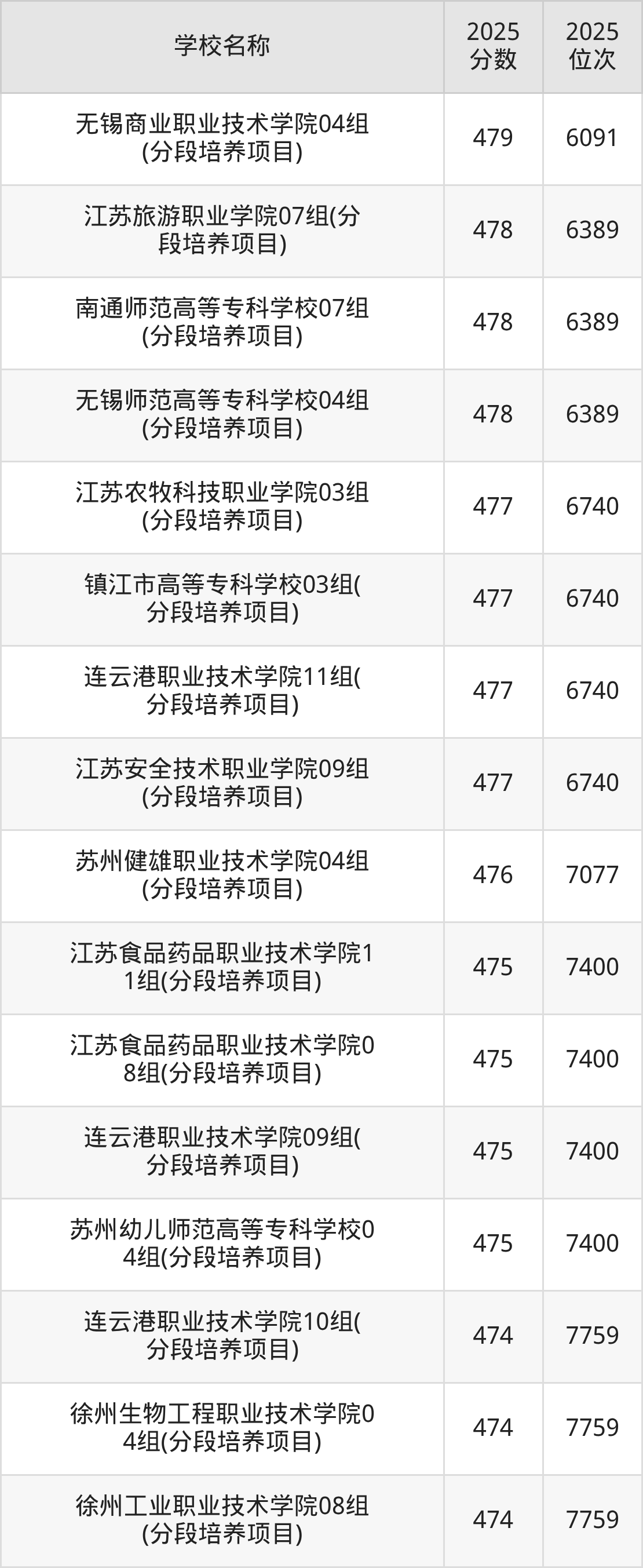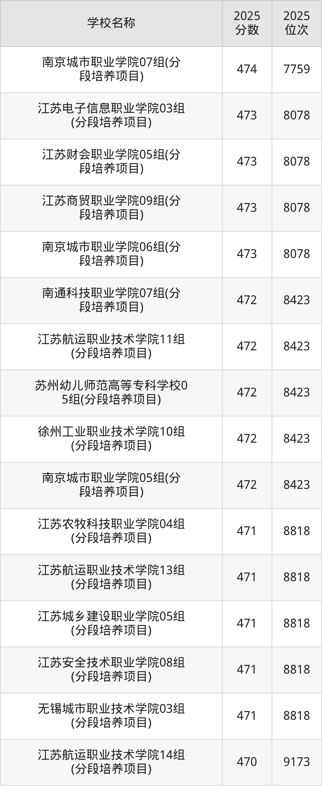 下文为2025年江苏省公办专科大学在江苏物理类录取分数线和位次排名表,供大家参考: