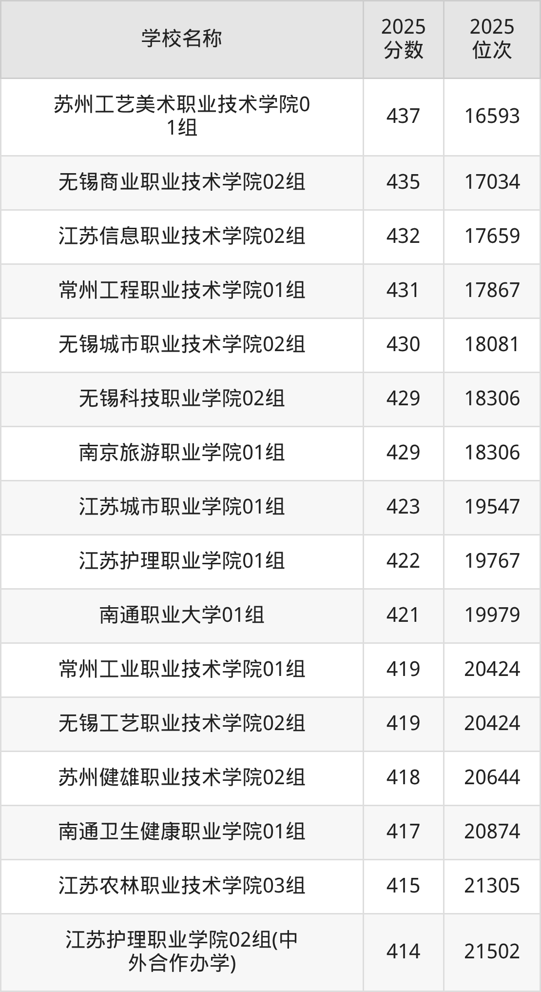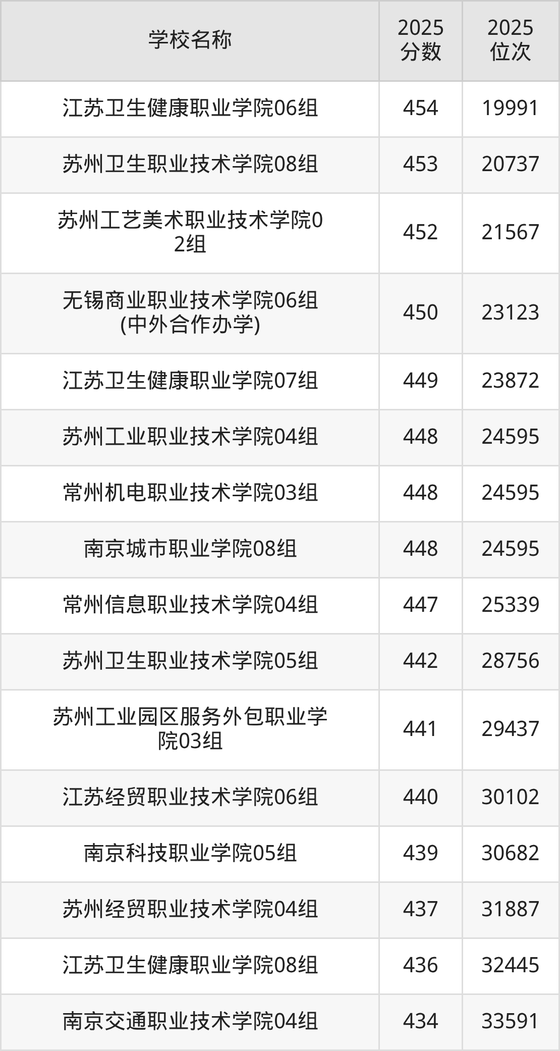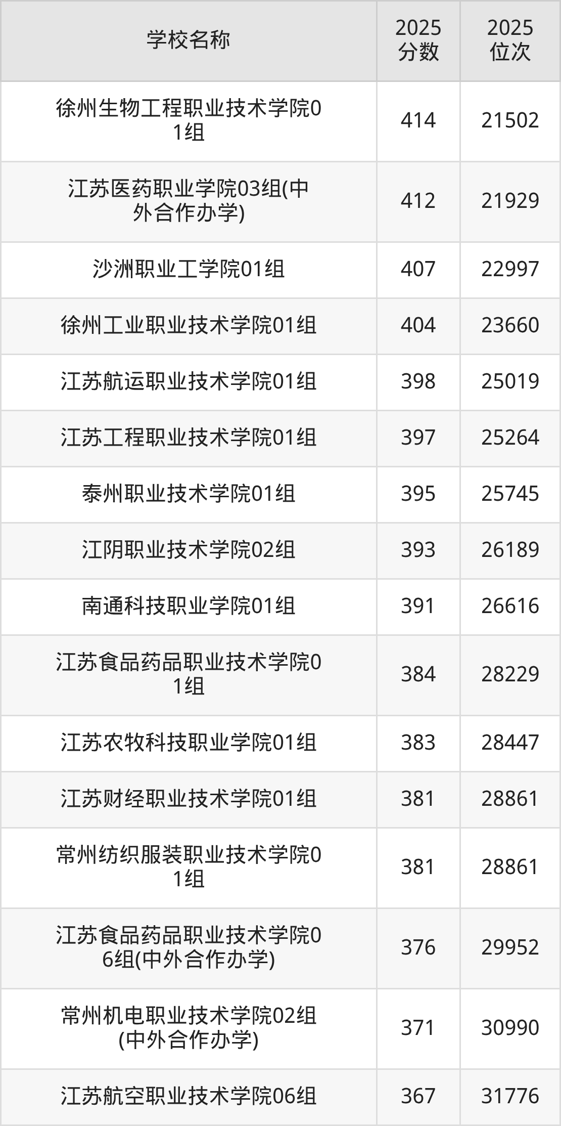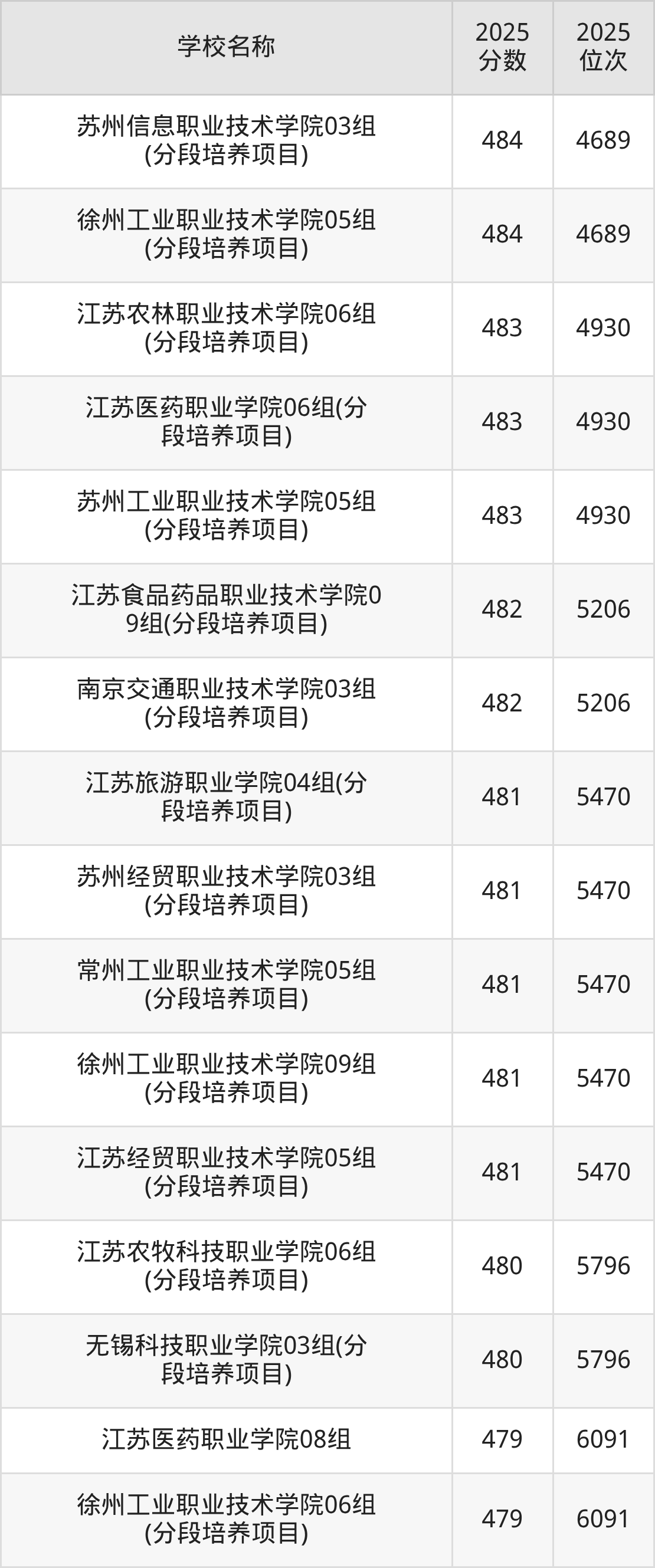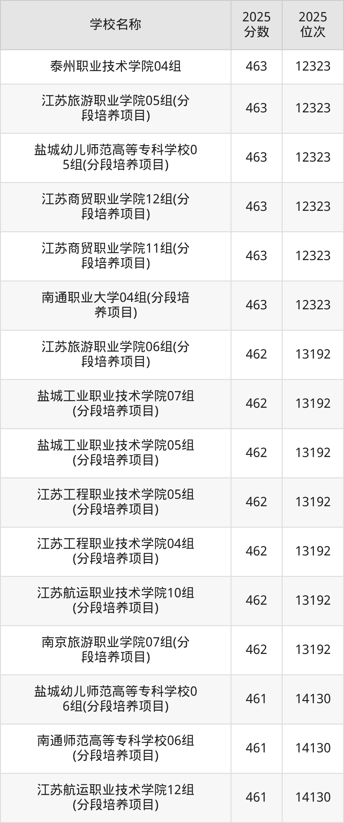 下文为2025年江苏省公办专科大学在江苏物理类录取分数线和位次排名表,供大家参考: