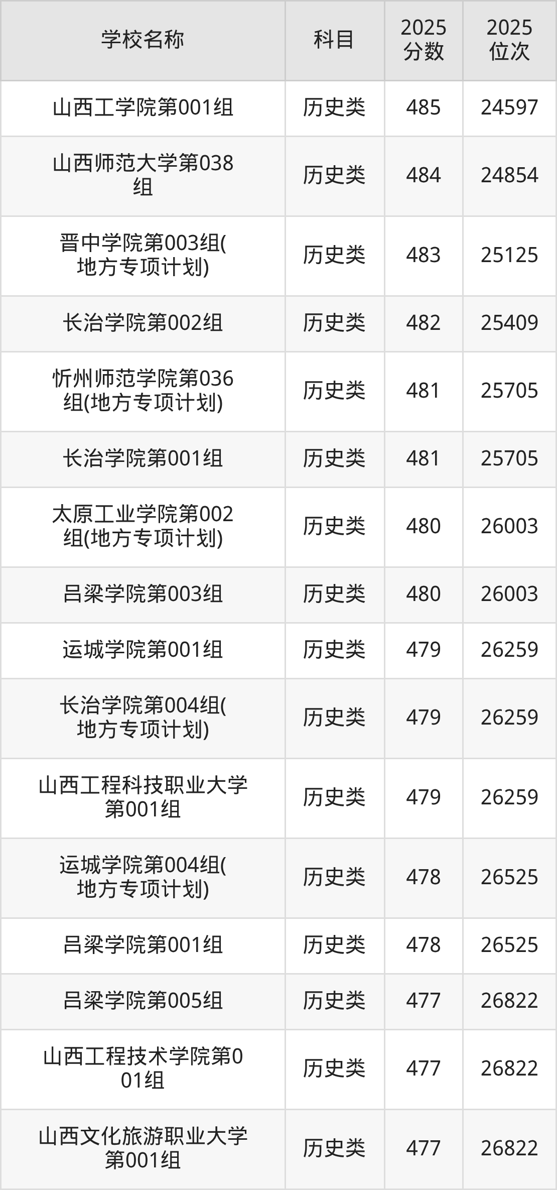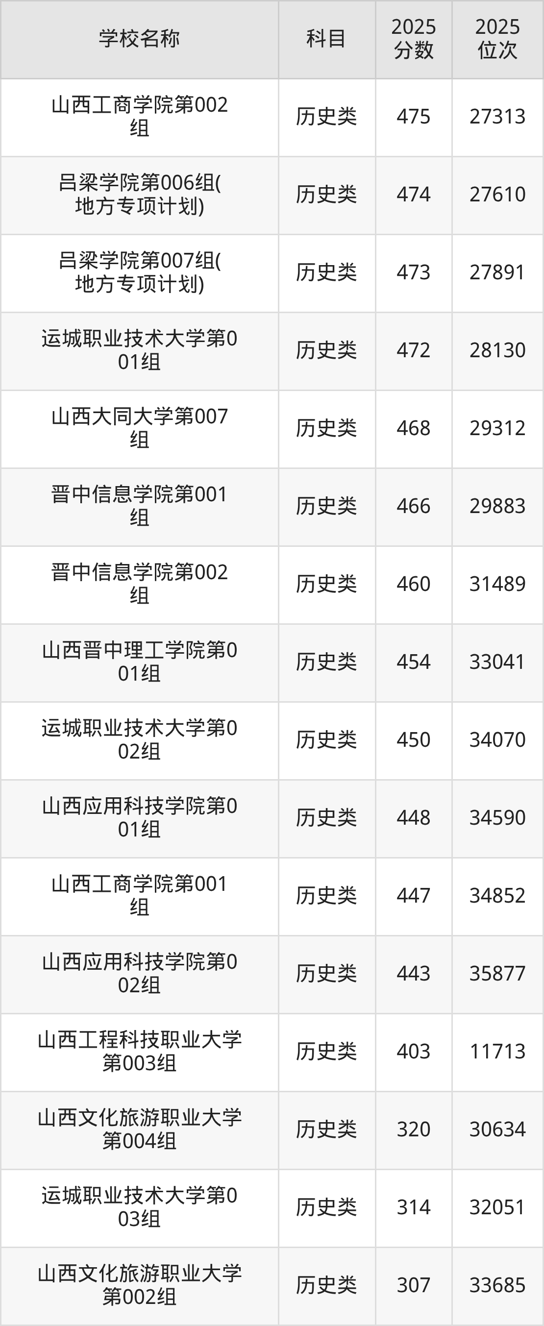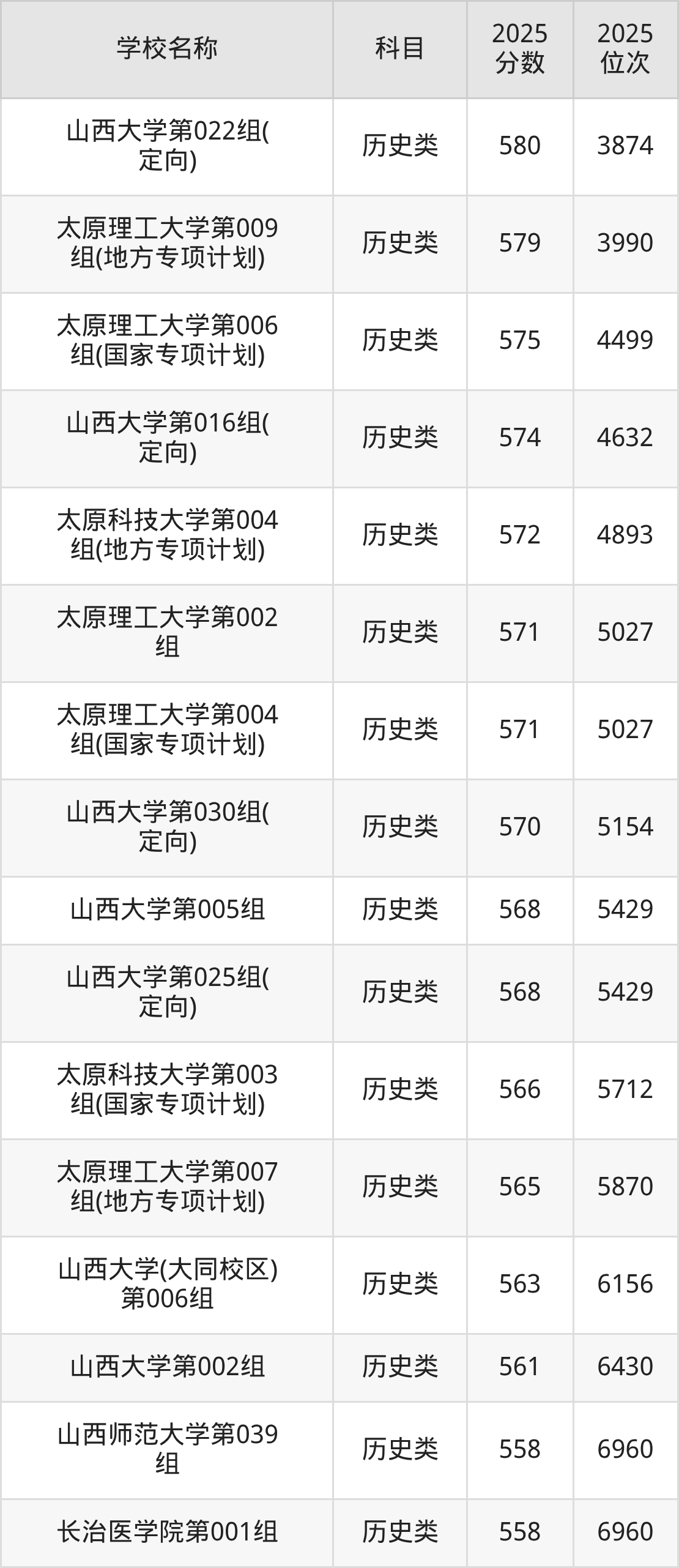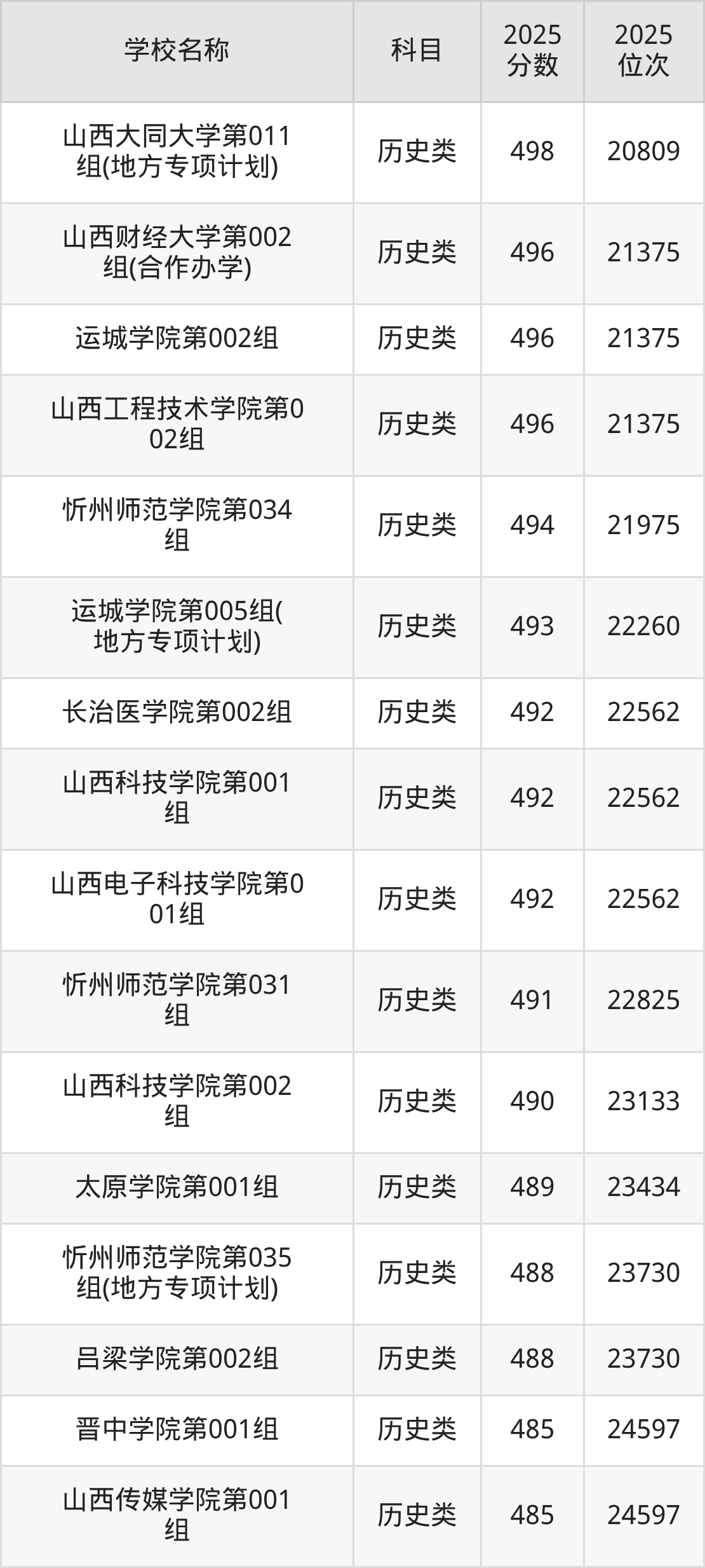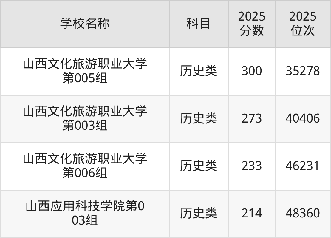 下文为2025年山西省本科大学在山西历史类录取分数线和位次排名表,供大家参考: