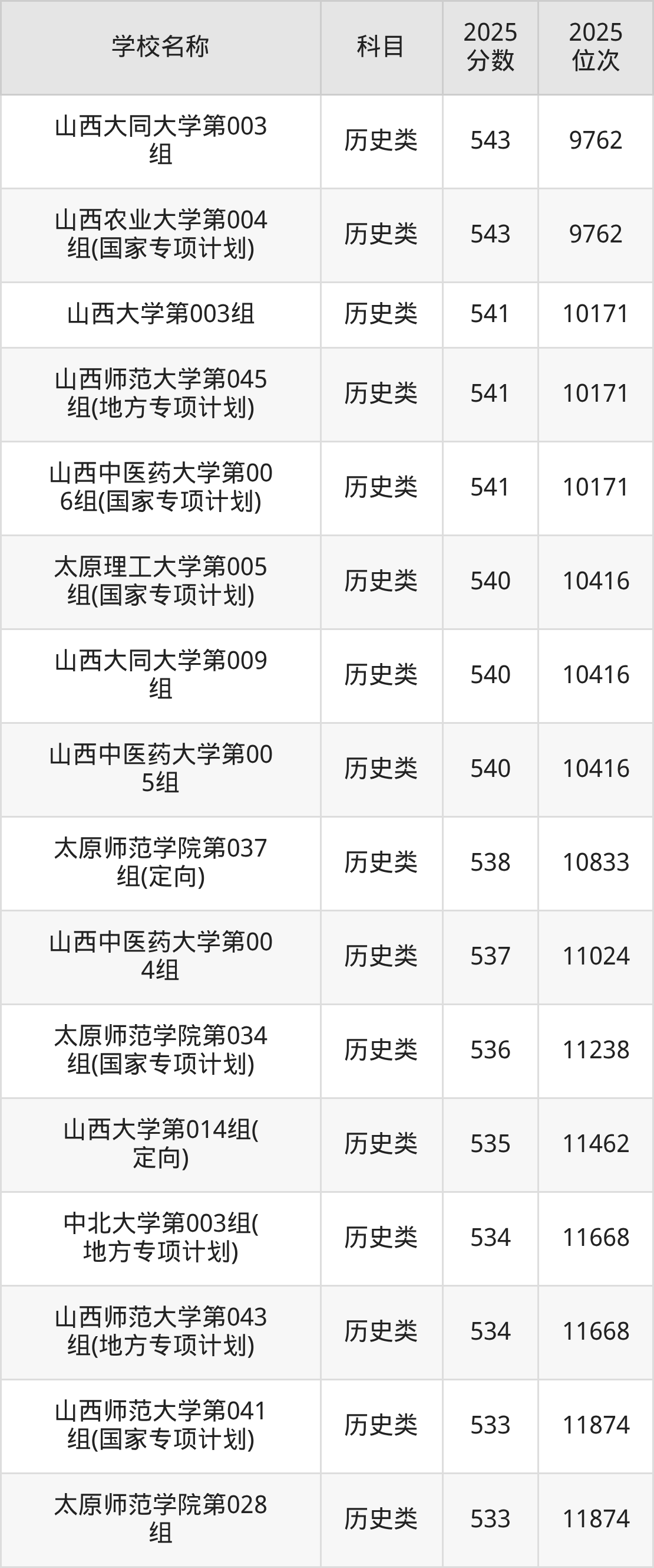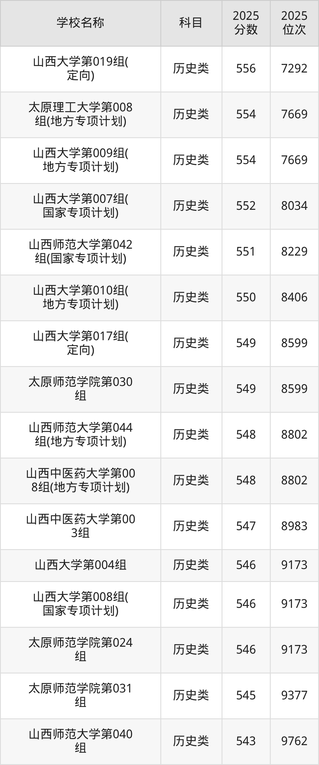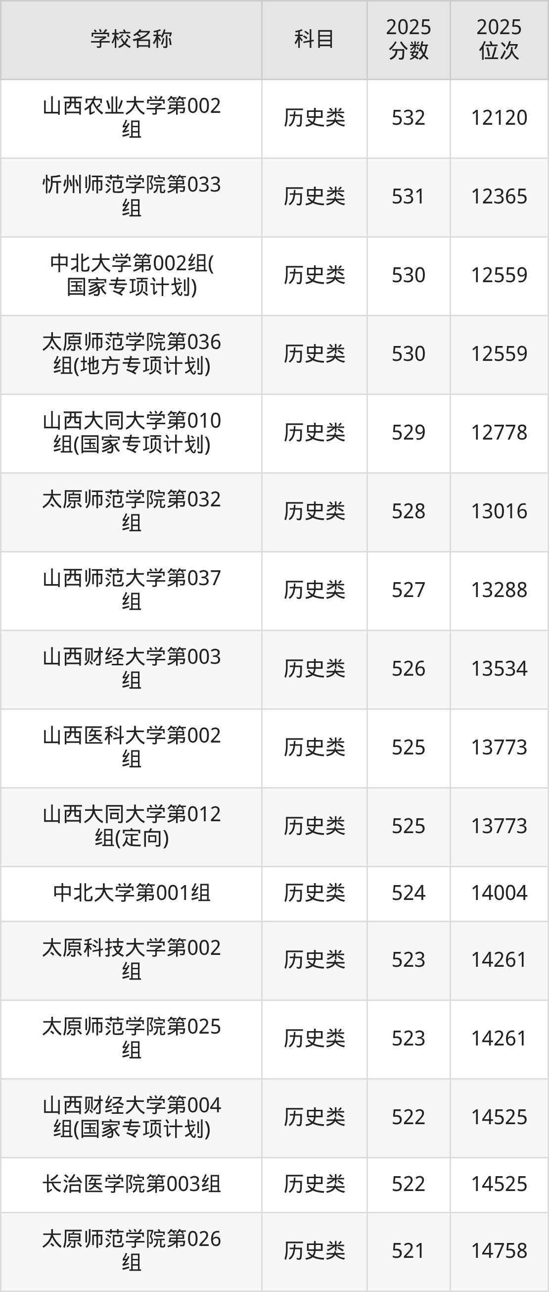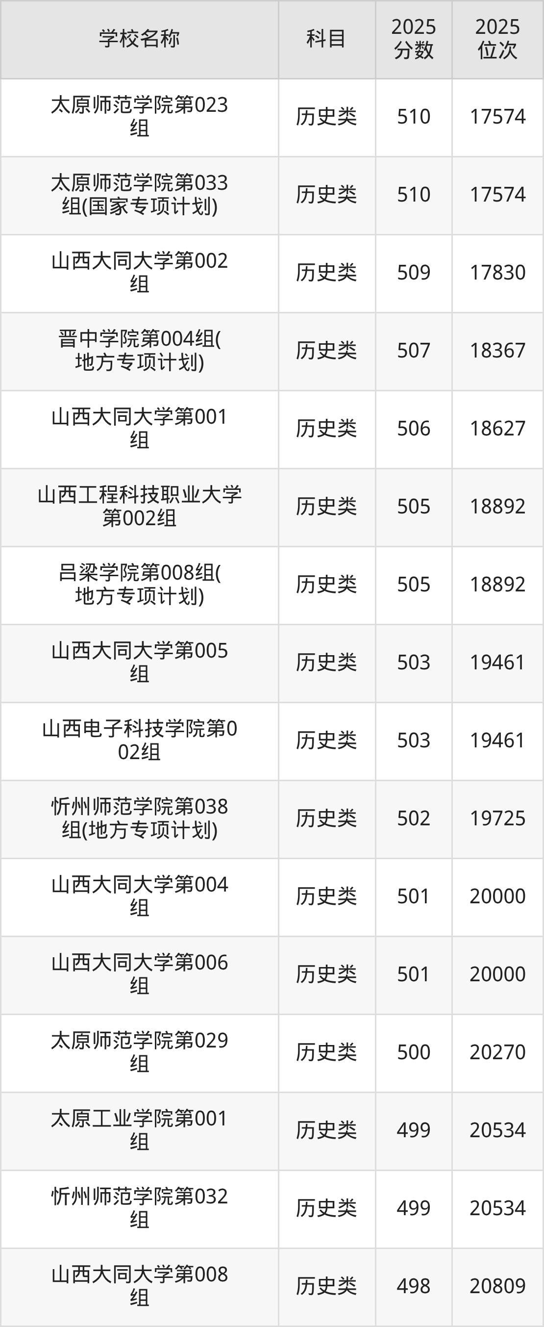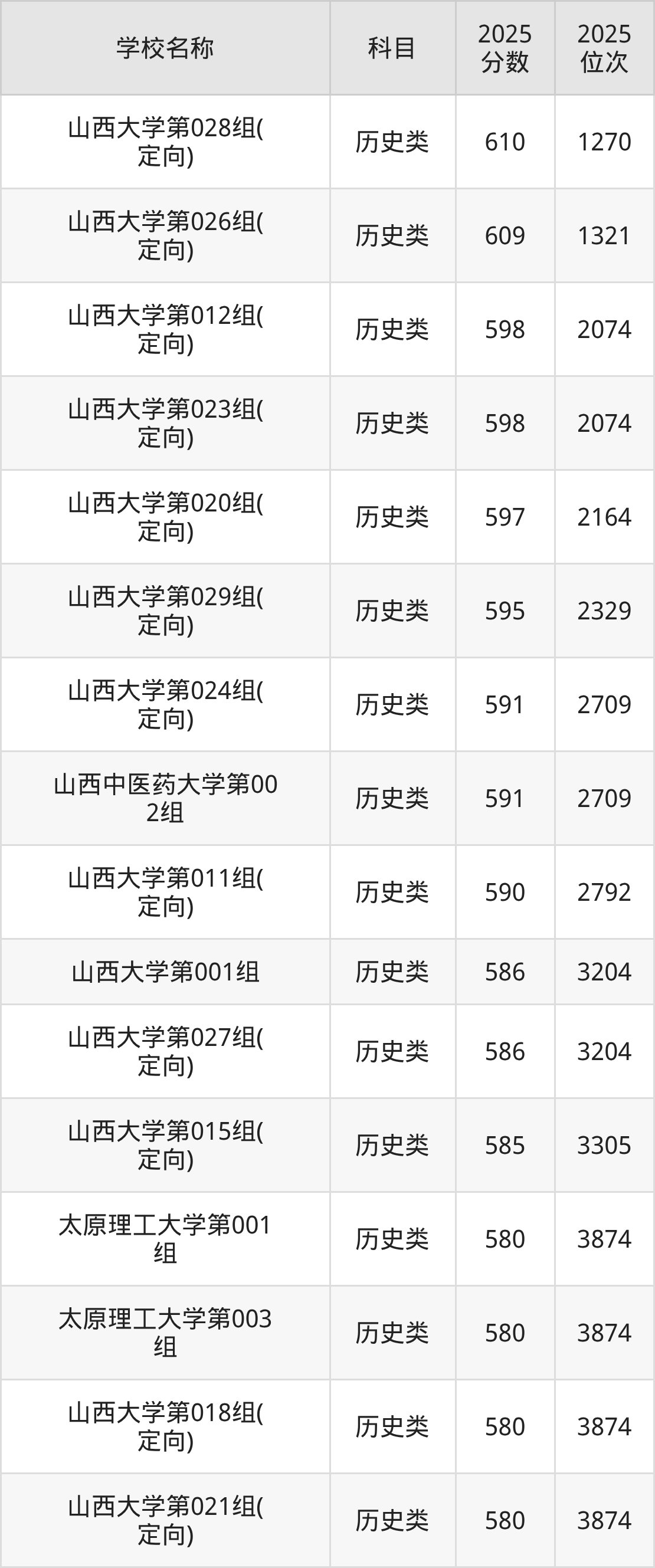 下文为2025年山西省本科大学在山西历史类录取分数线和位次排名表,供大家参考: