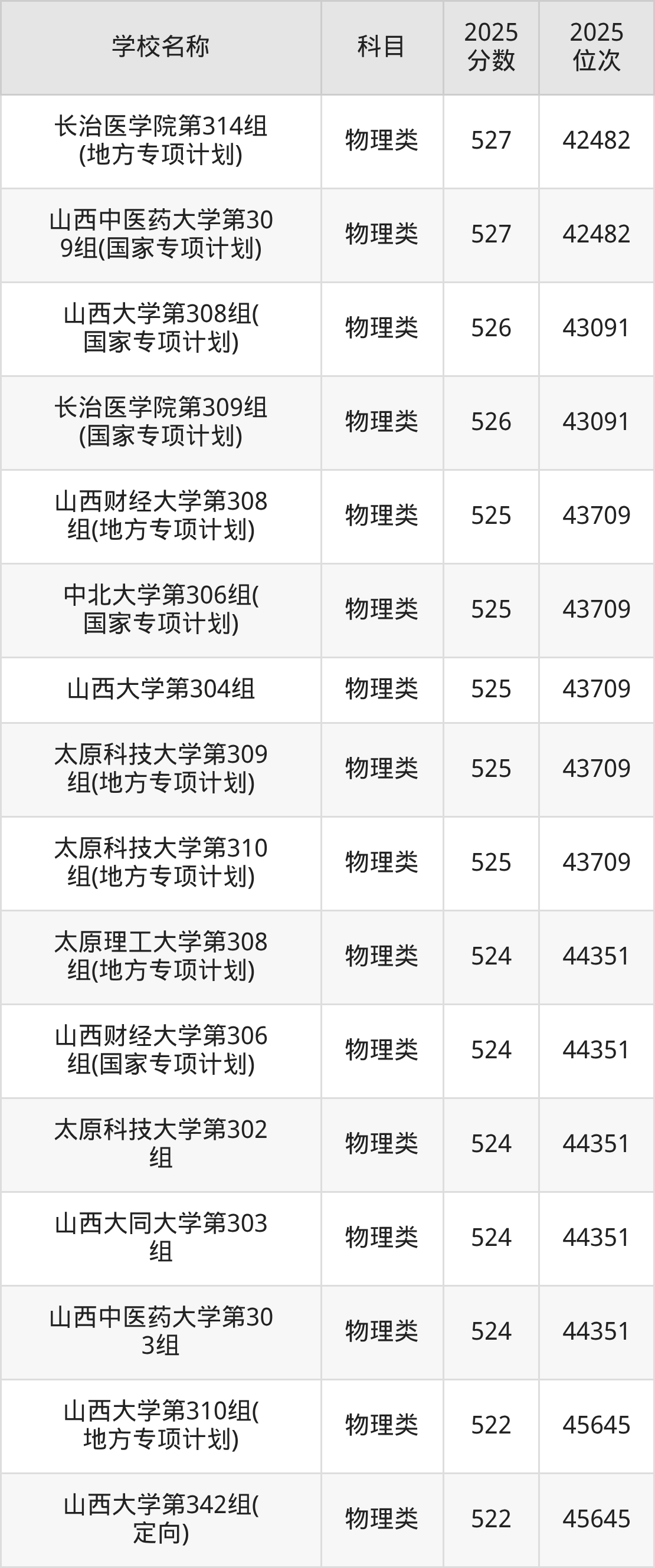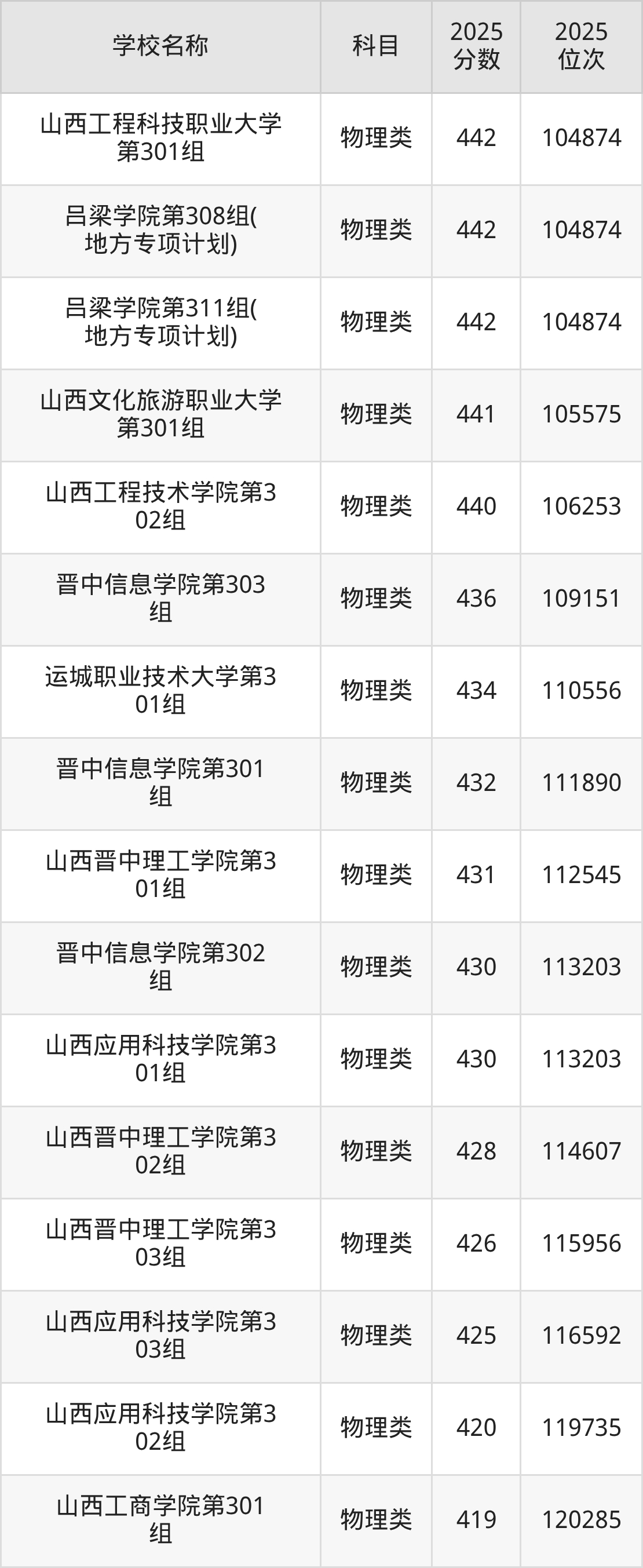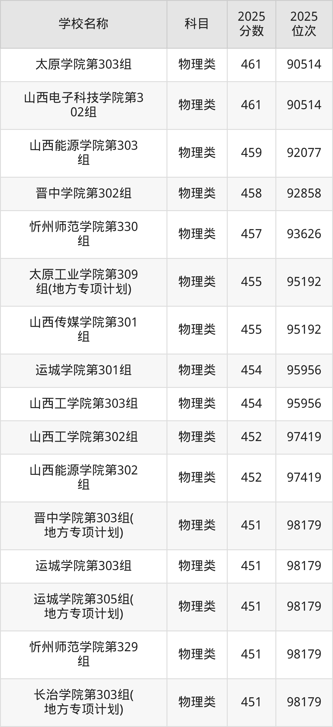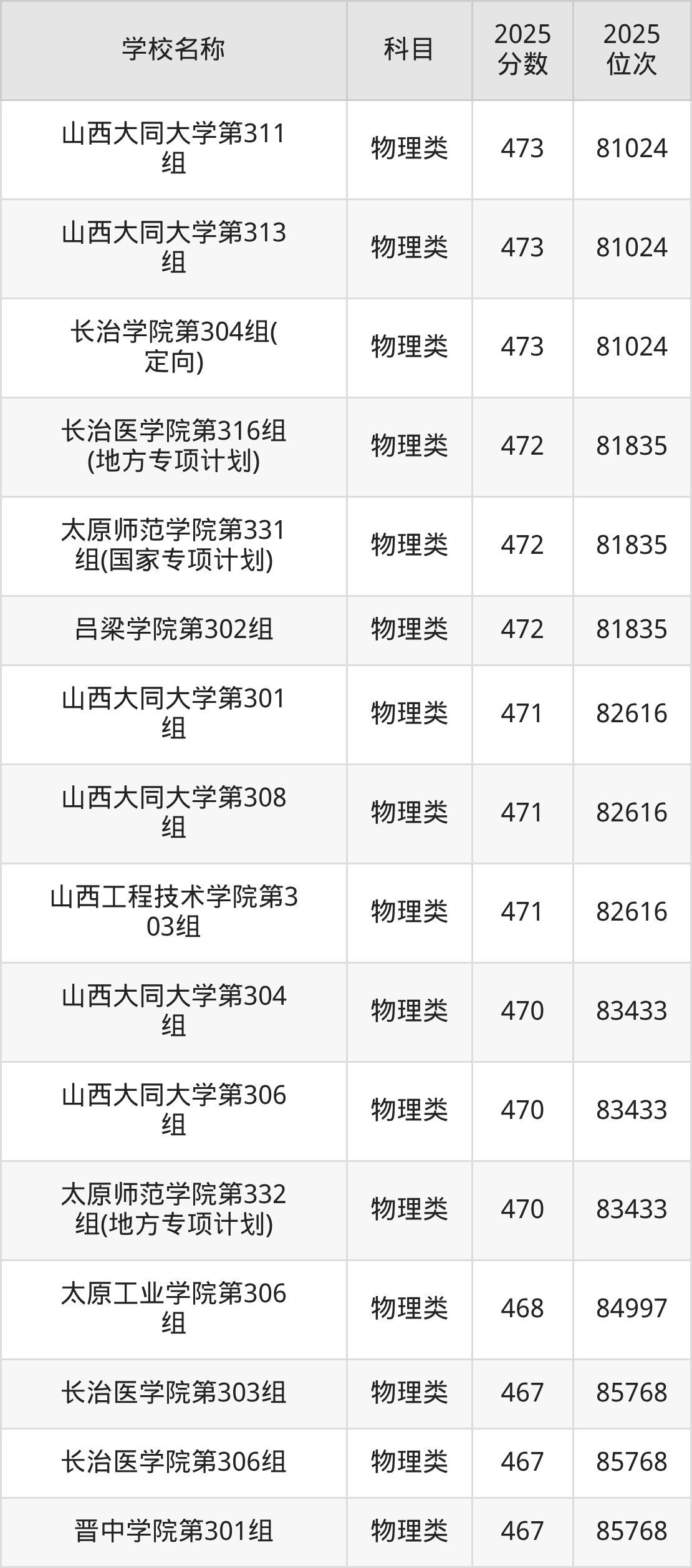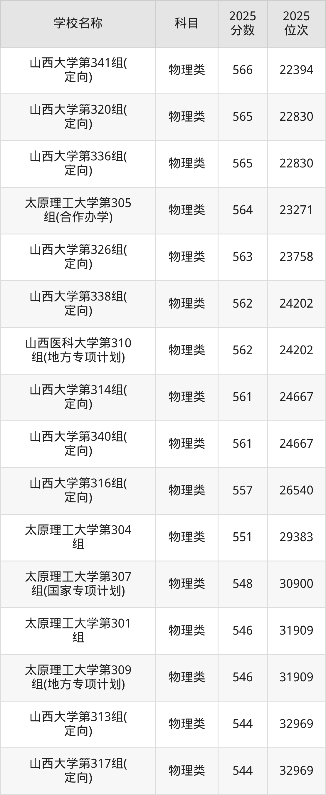 下文为2025年山西省本科大学在山西物理类录取分数线和位次排名表,供大家参考: