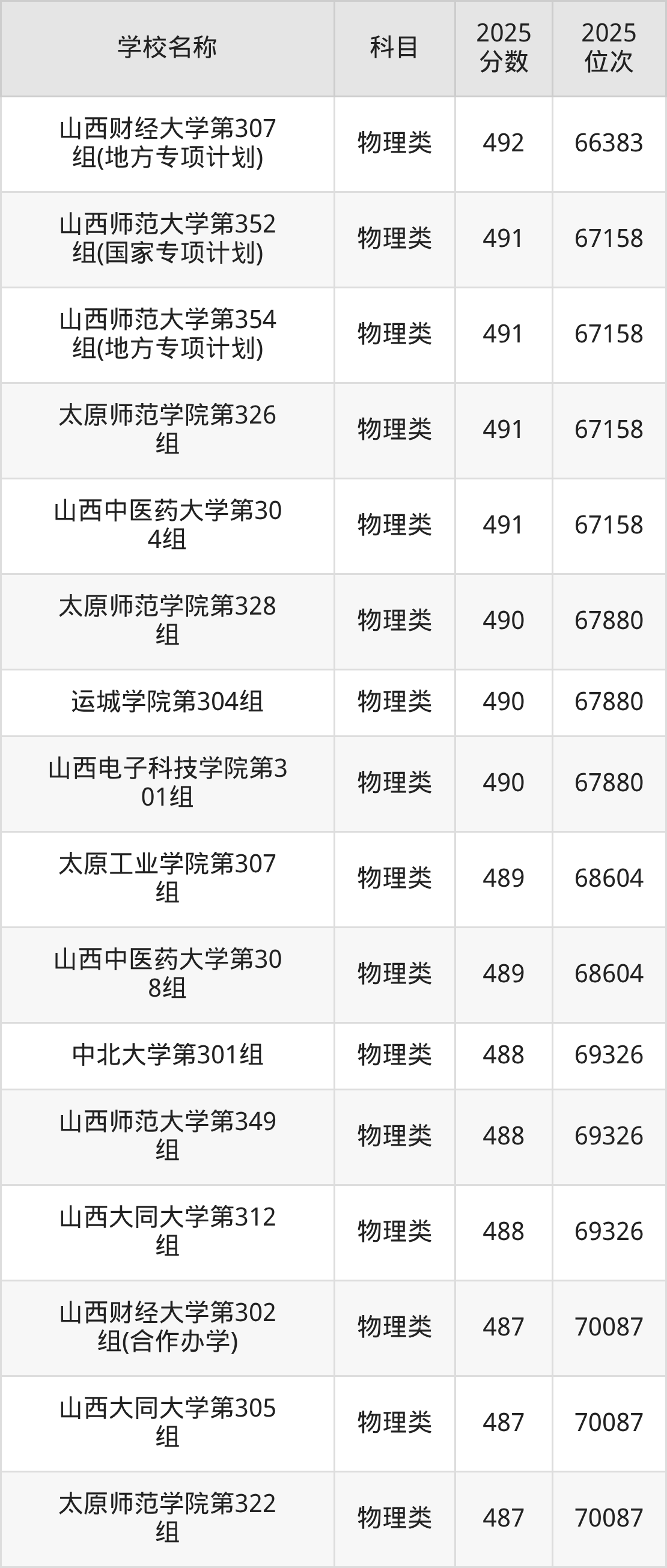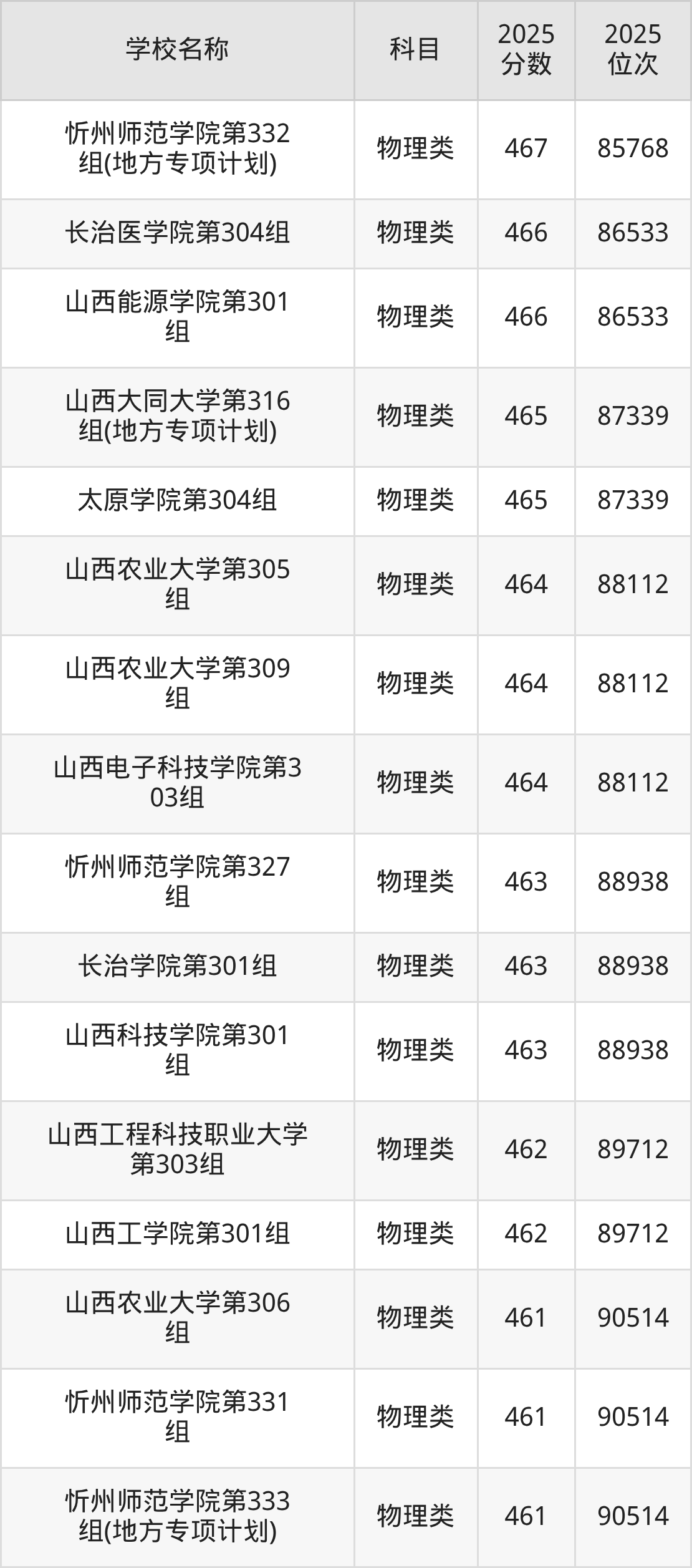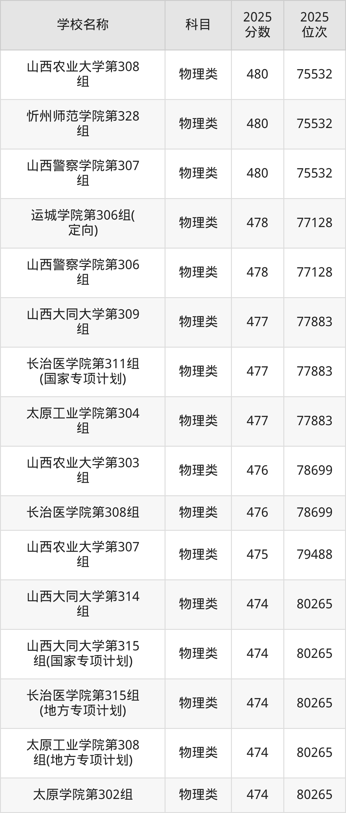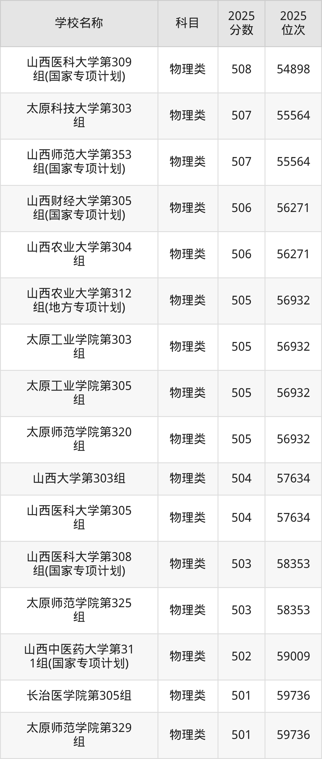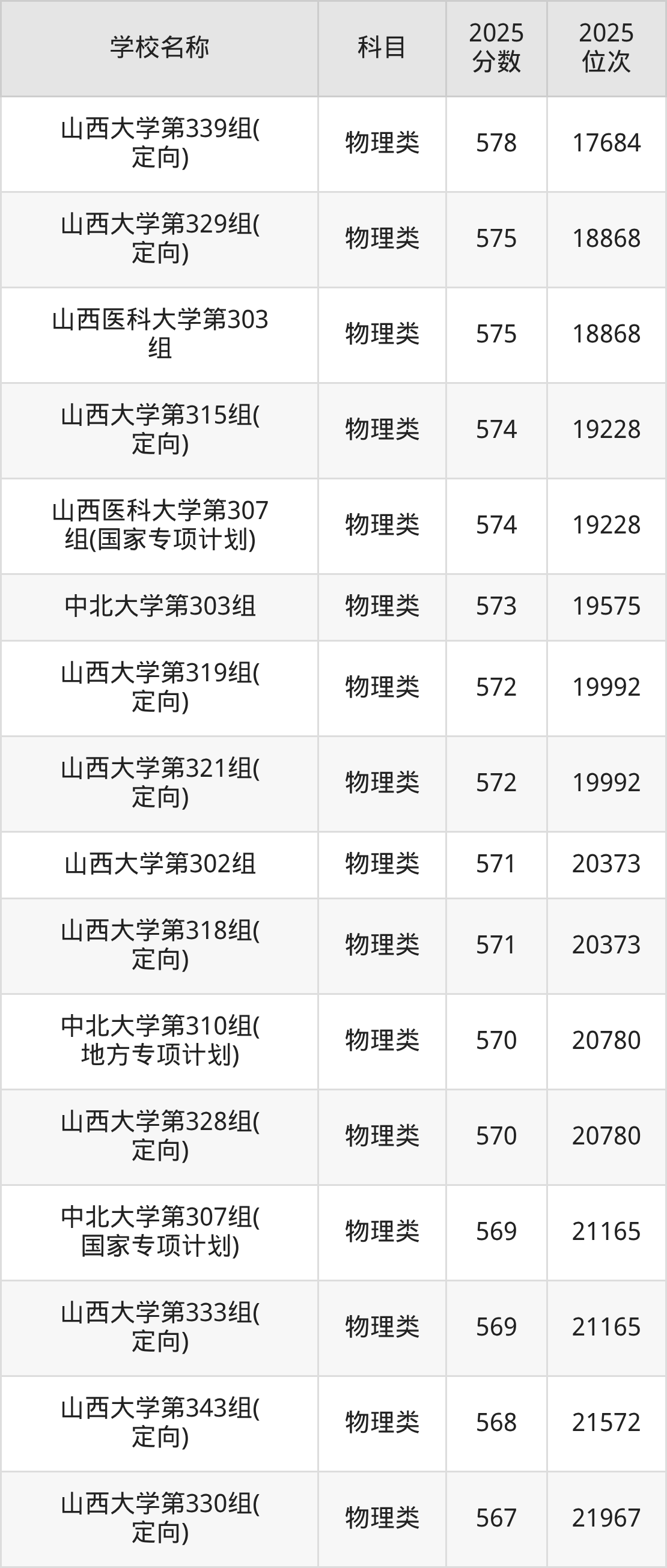 下文为2025年山西省本科大学在山西物理类录取分数线和位次排名表,供大家参考: