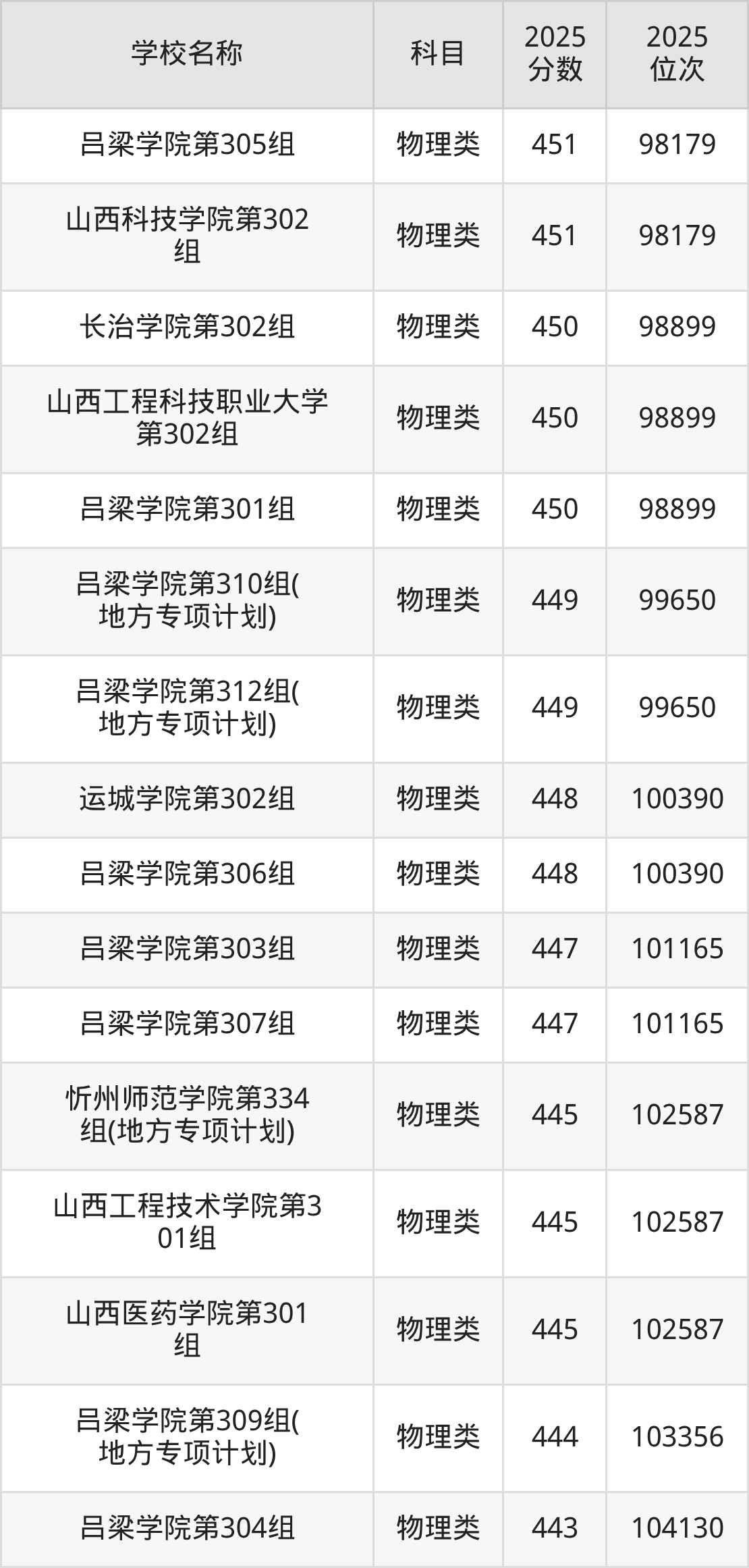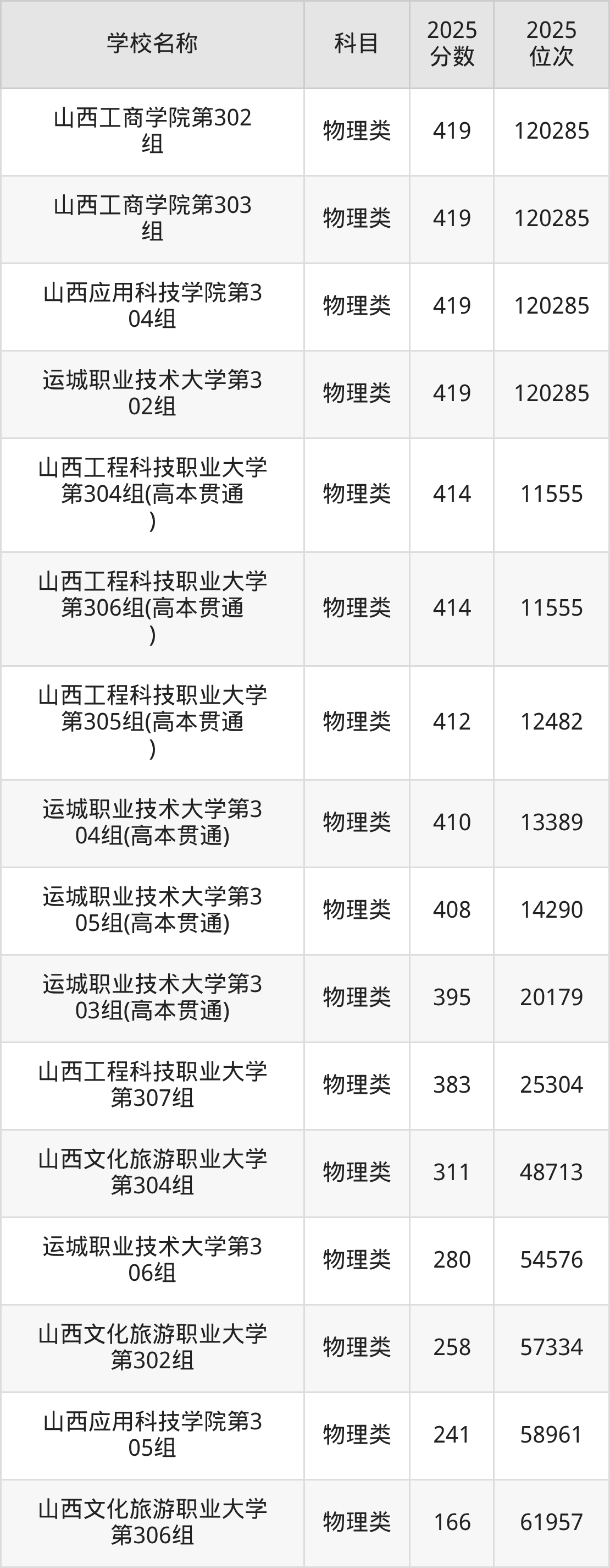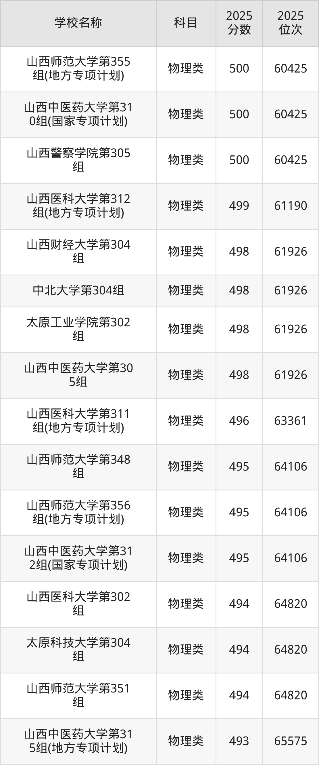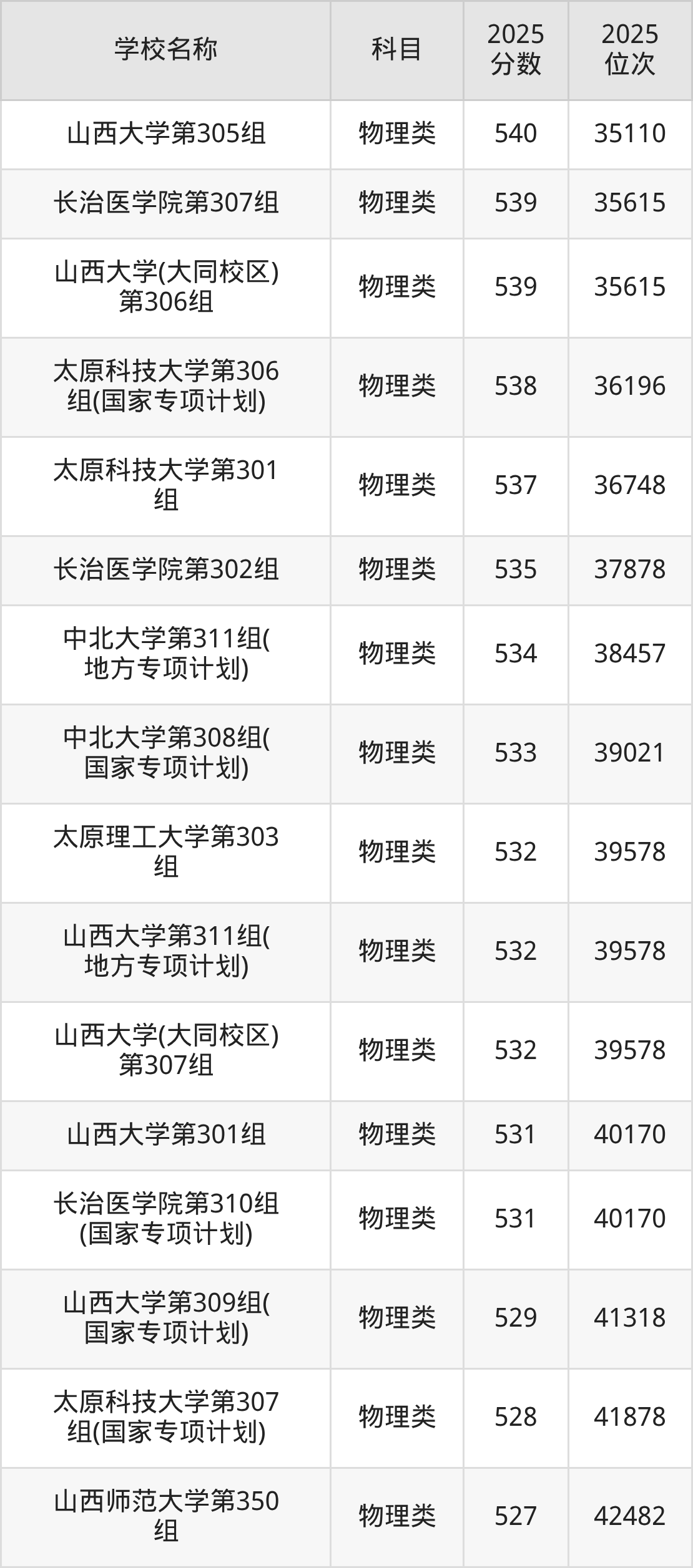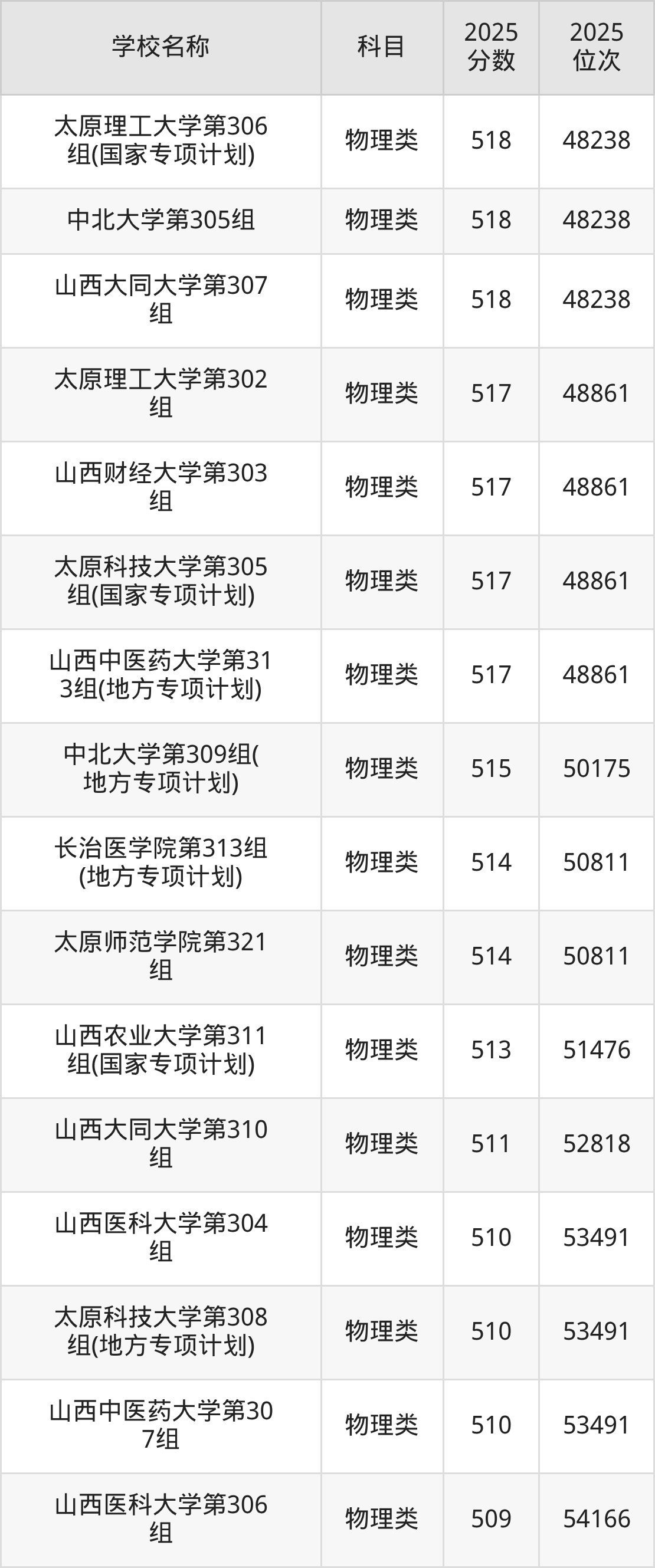 下文为2025年山西省本科大学在山西物理类录取分数线和位次排名表,供大家参考: