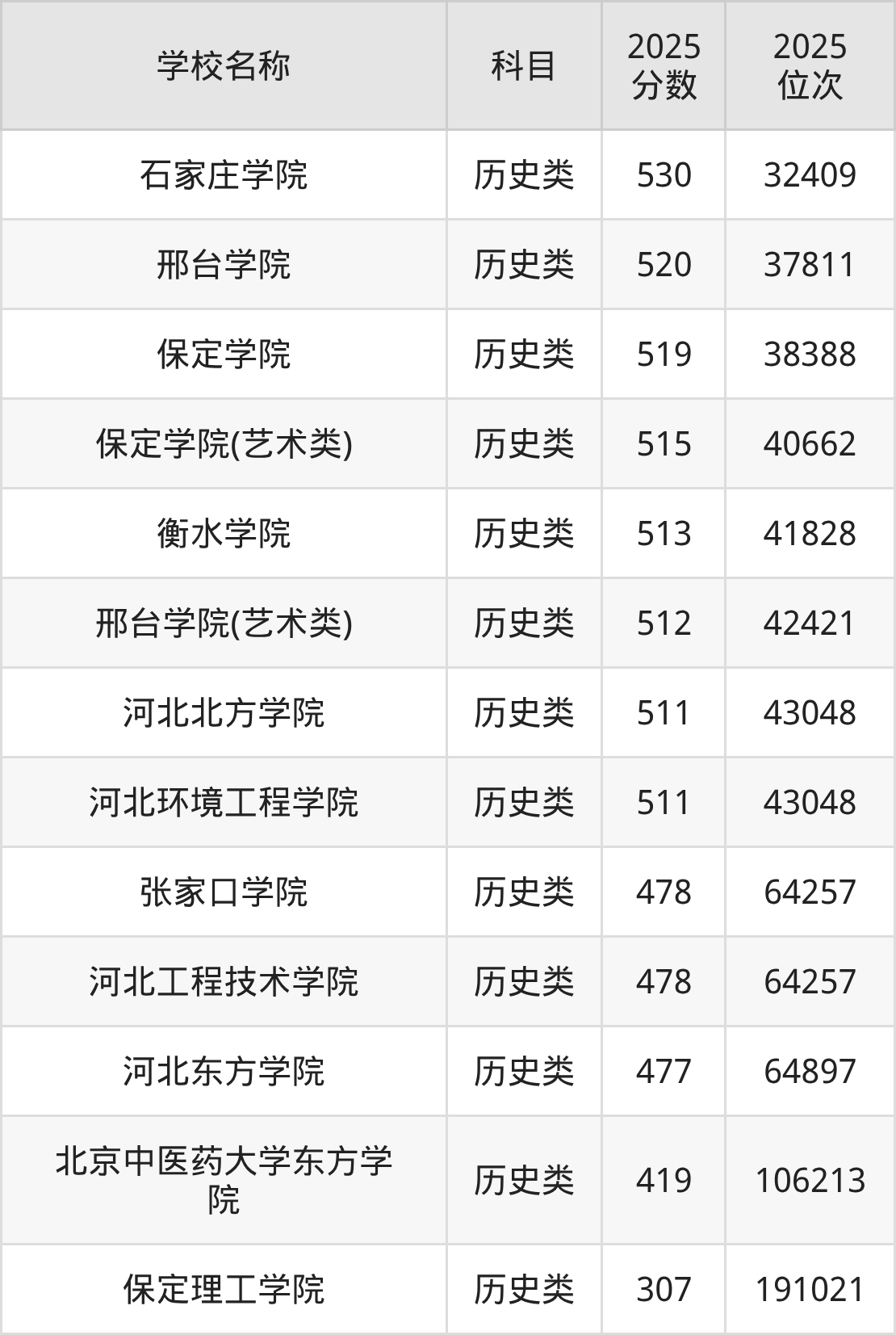 下文为2025年河北省二本综合大学在河北历史类录取分数线和位次排名表,供大家参考: