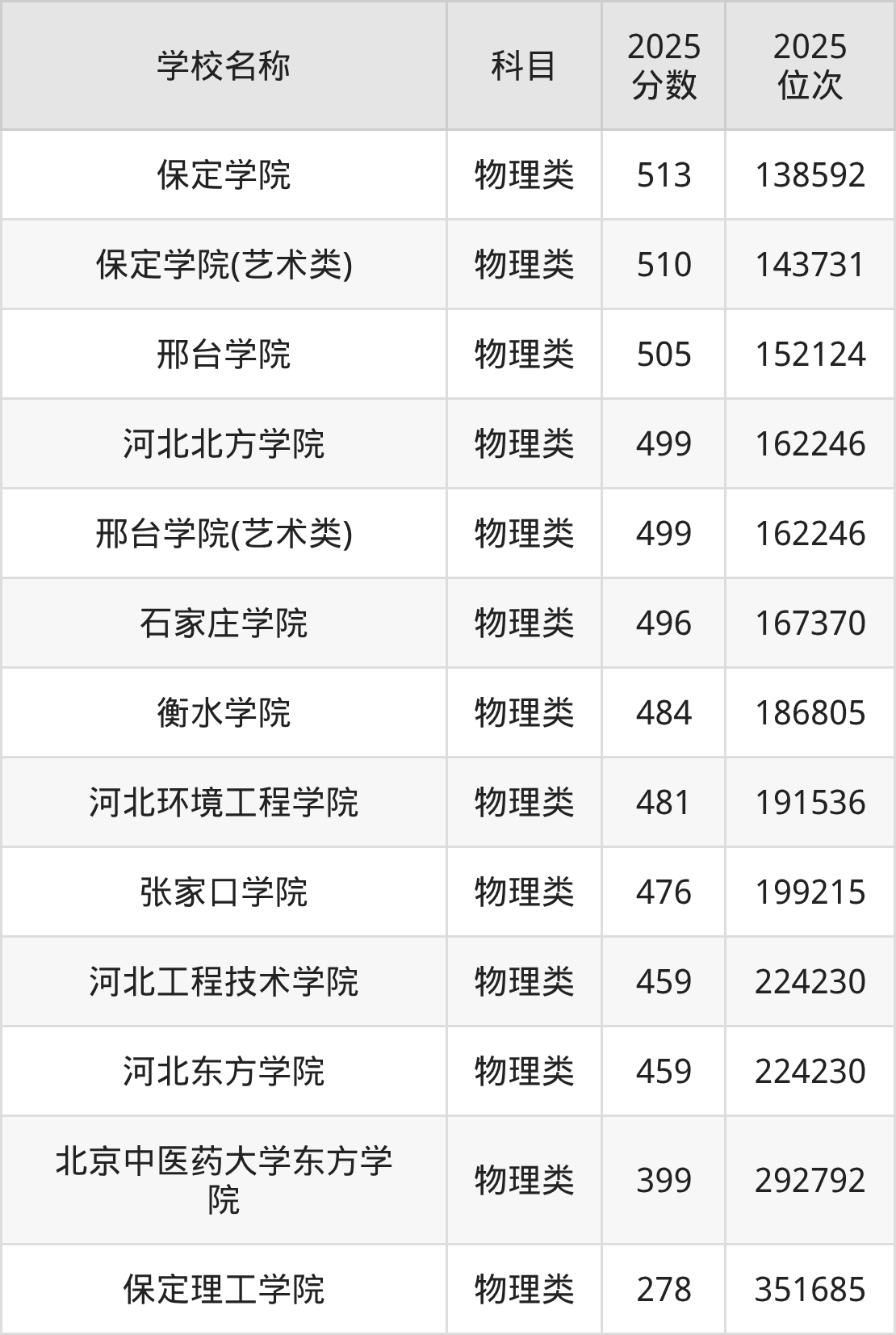 下文为2025年河北省二本综合大学在河北物理类录取分数线和位次排名表,供大家参考: