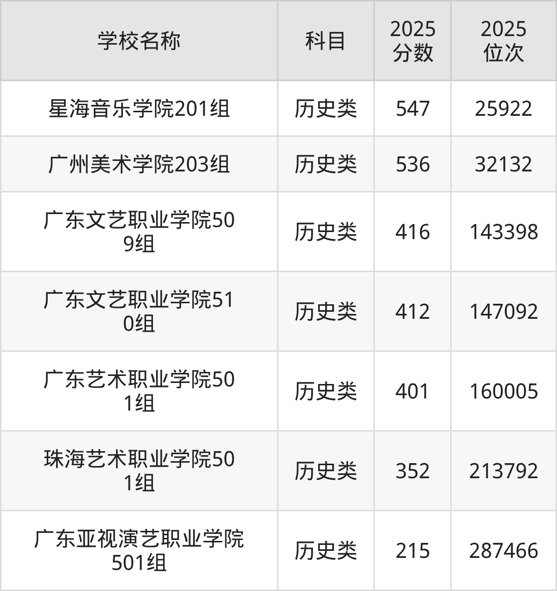 下文为2025年广东省艺术类大学在广东历史类录取分数线和位次排名表,供大家参考: