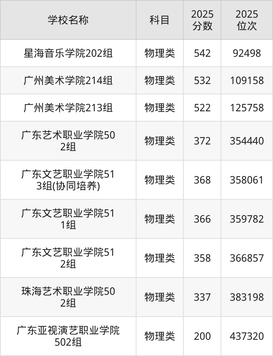 下文为2025年广东省艺术类大学在广东物理类录取分数线和位次排名表,供大家参考:
