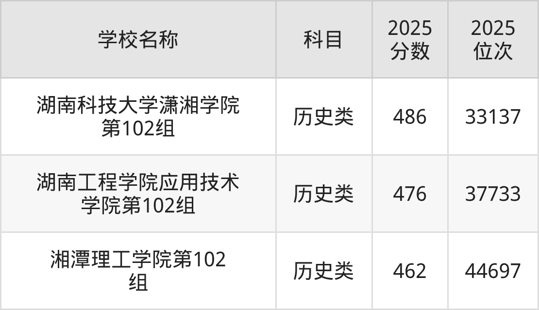 下文为2025年湘潭市民办二本大学在湖南历史类录取分数线和位次排名表,供大家参考: